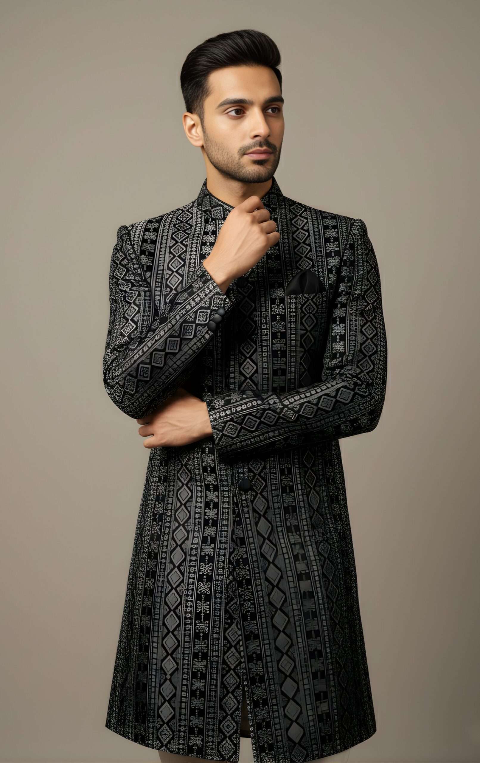 This magnificent Indo-Western Sherwani style outfit is an exquisite combination of premium Velvet fabric and intricate thread sequins embroidery. Its dark color and modern geometric pattern make it an impactful and sophisticated choice for grand evening functions.