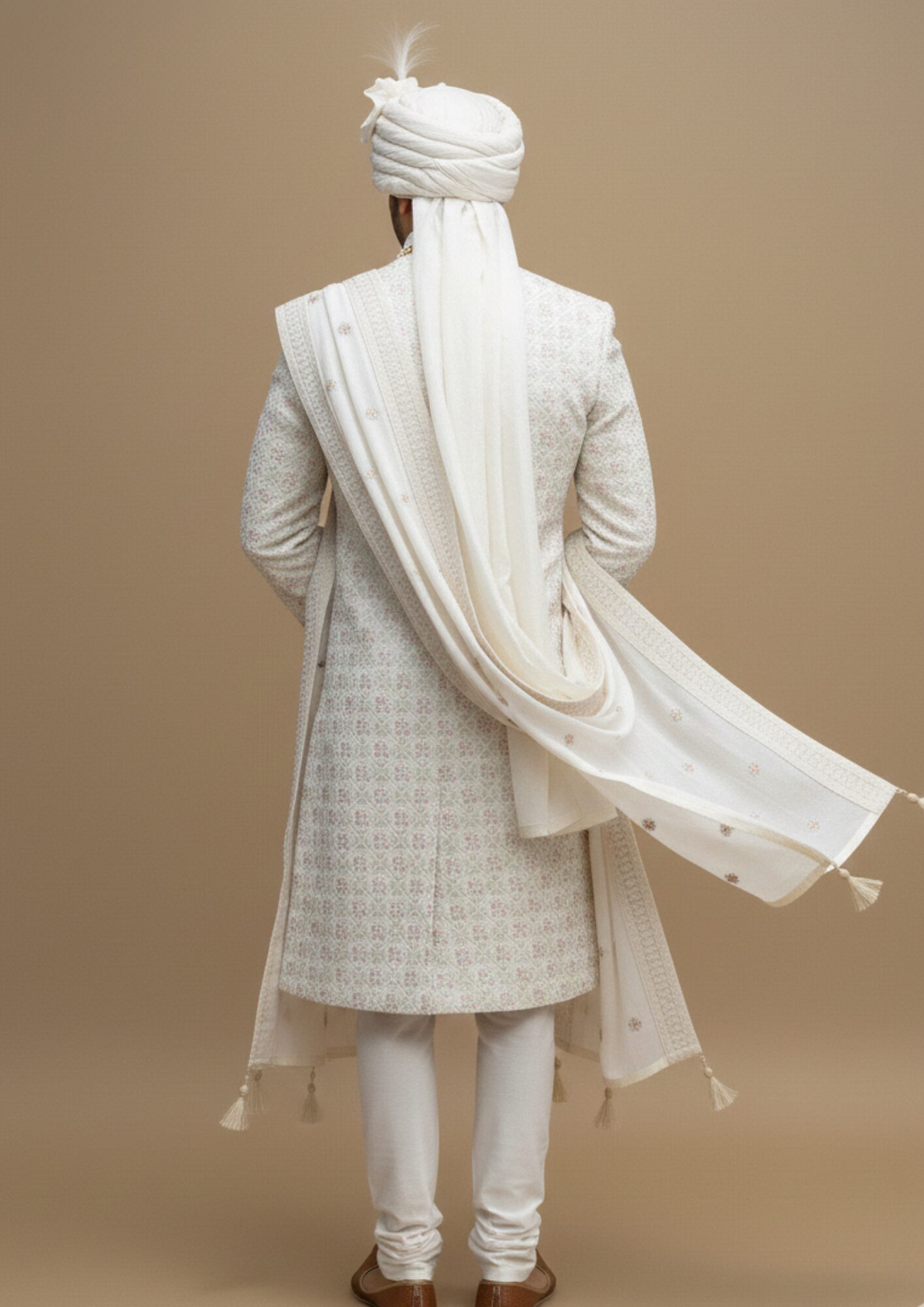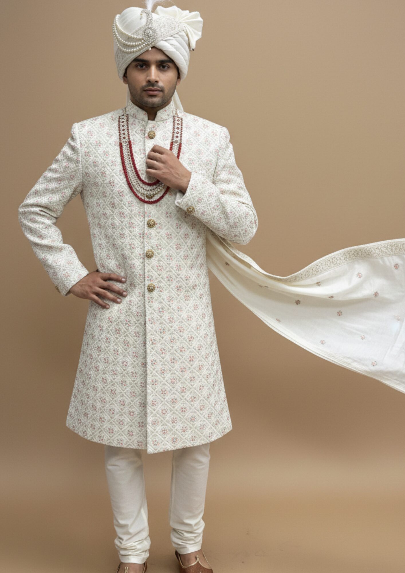 Intricate Embroidery: The Sherwani features a stunning all-over floral and geometric self-embroidery (tone-on-tone), creating a deep, 3D textured effect that catches the light beautifully.