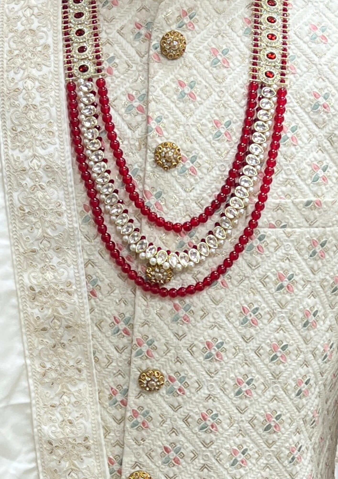 Premium Mala: Included is a majestic, multi-layered pearl necklace that perfectly complements the pearl-white tone of the outfit.
