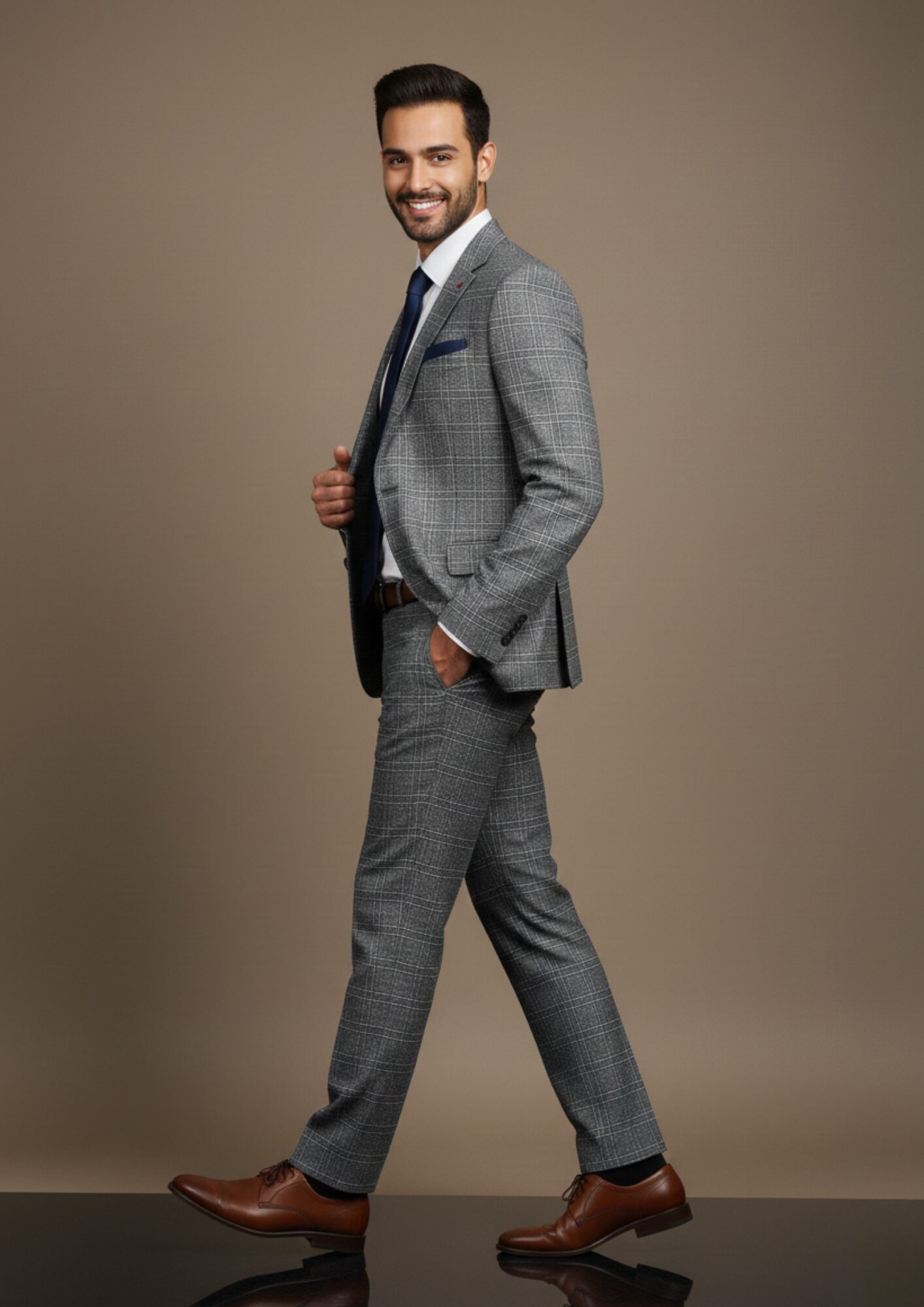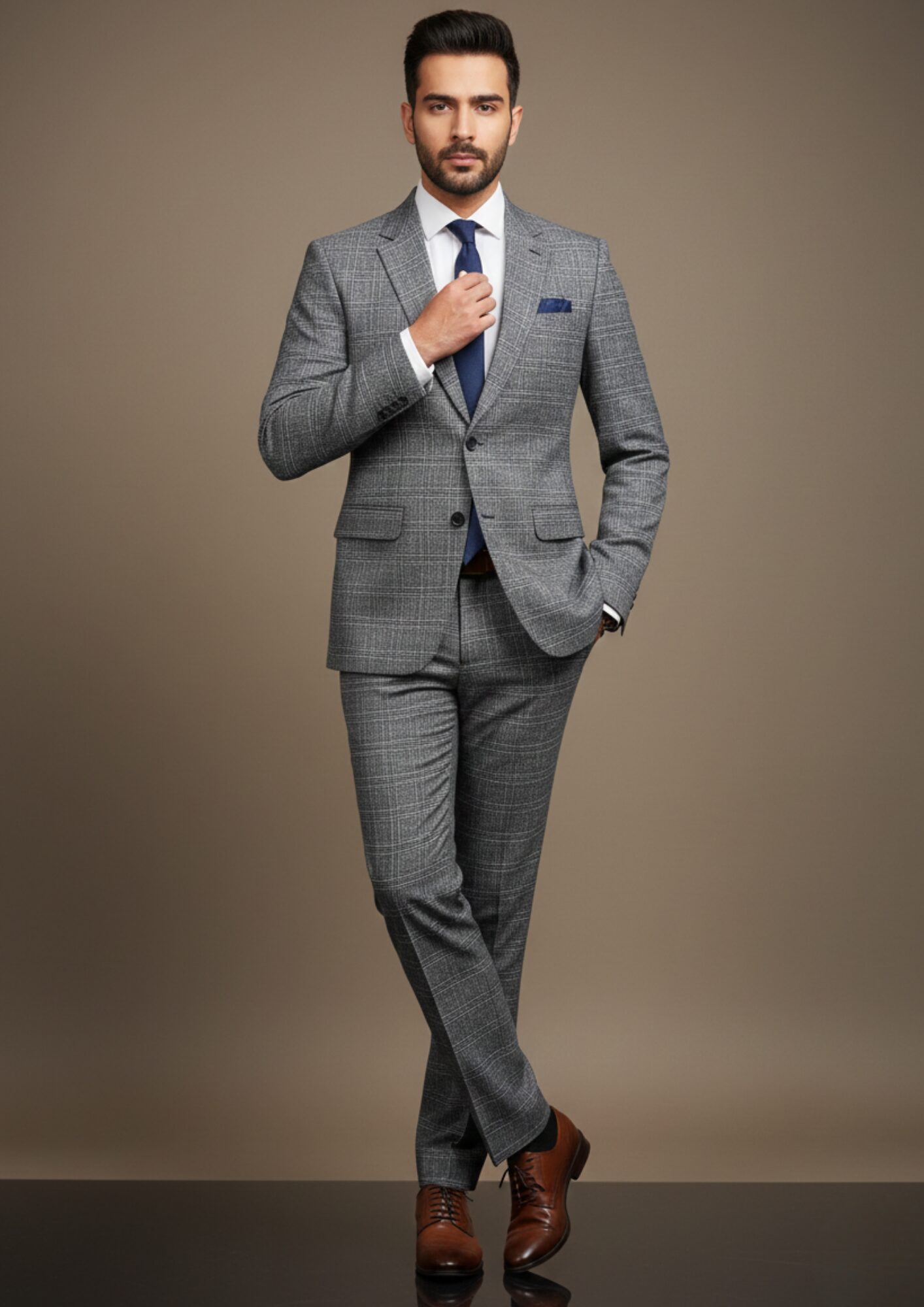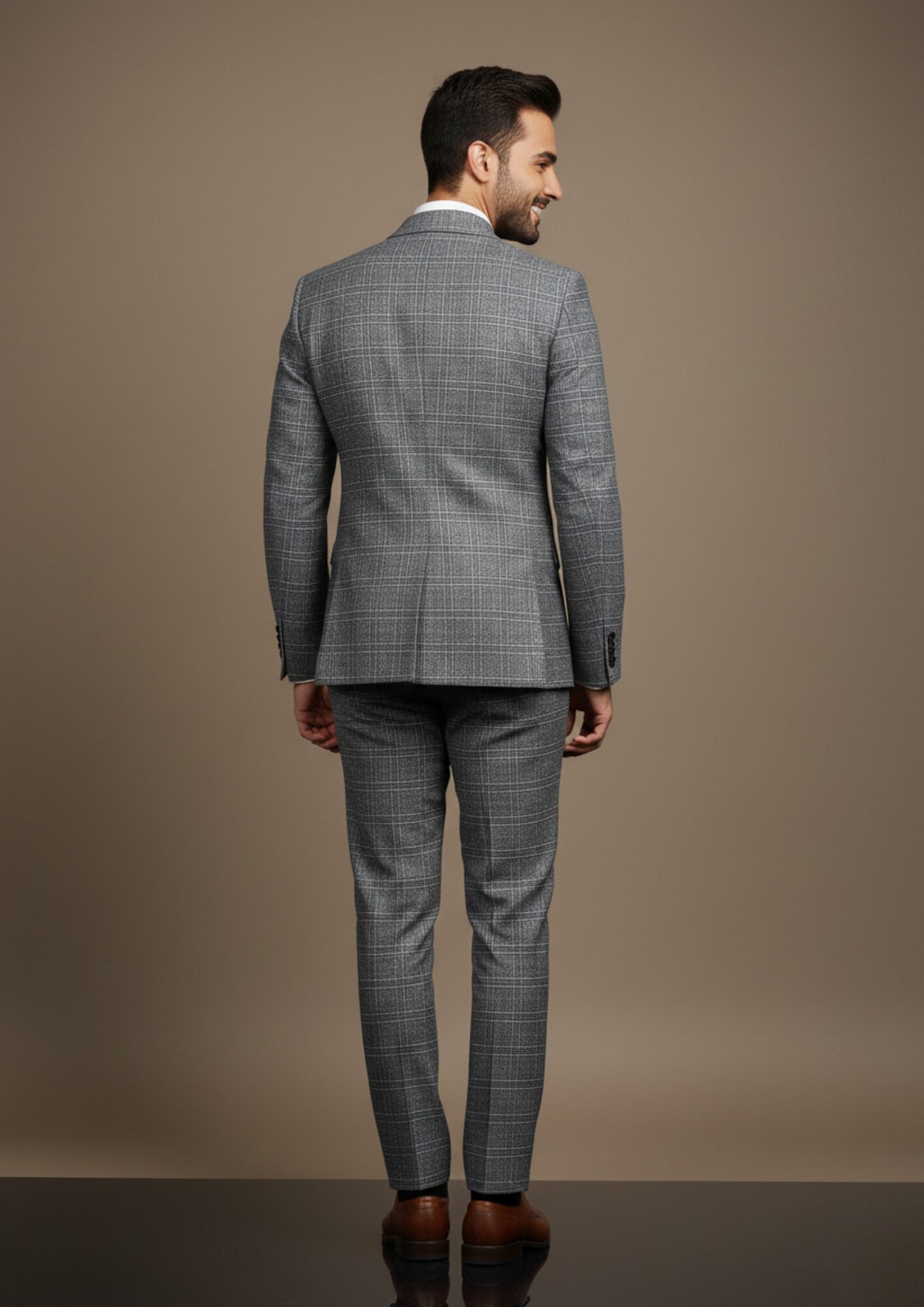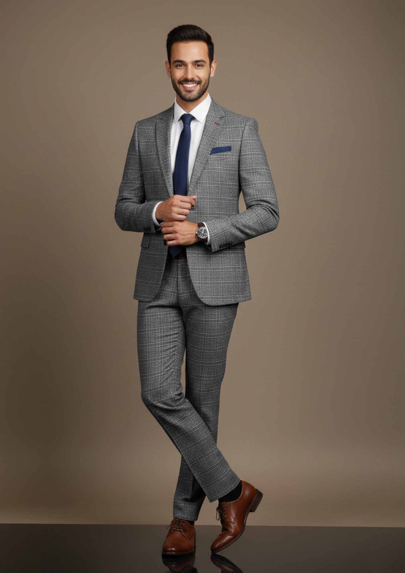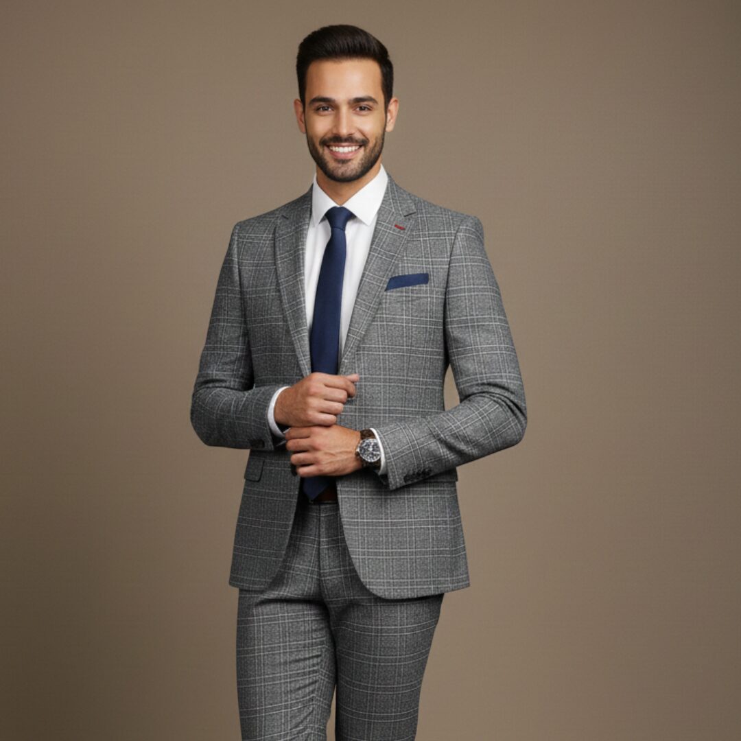 This distinguished grey checkered suit is the perfect blend of classic tailoring and modern pattern. The distinct windowpane check adds sophisticated character to the medium grey base, making it an excellent choice for the professional who wants to make a subtle yet powerful statement.