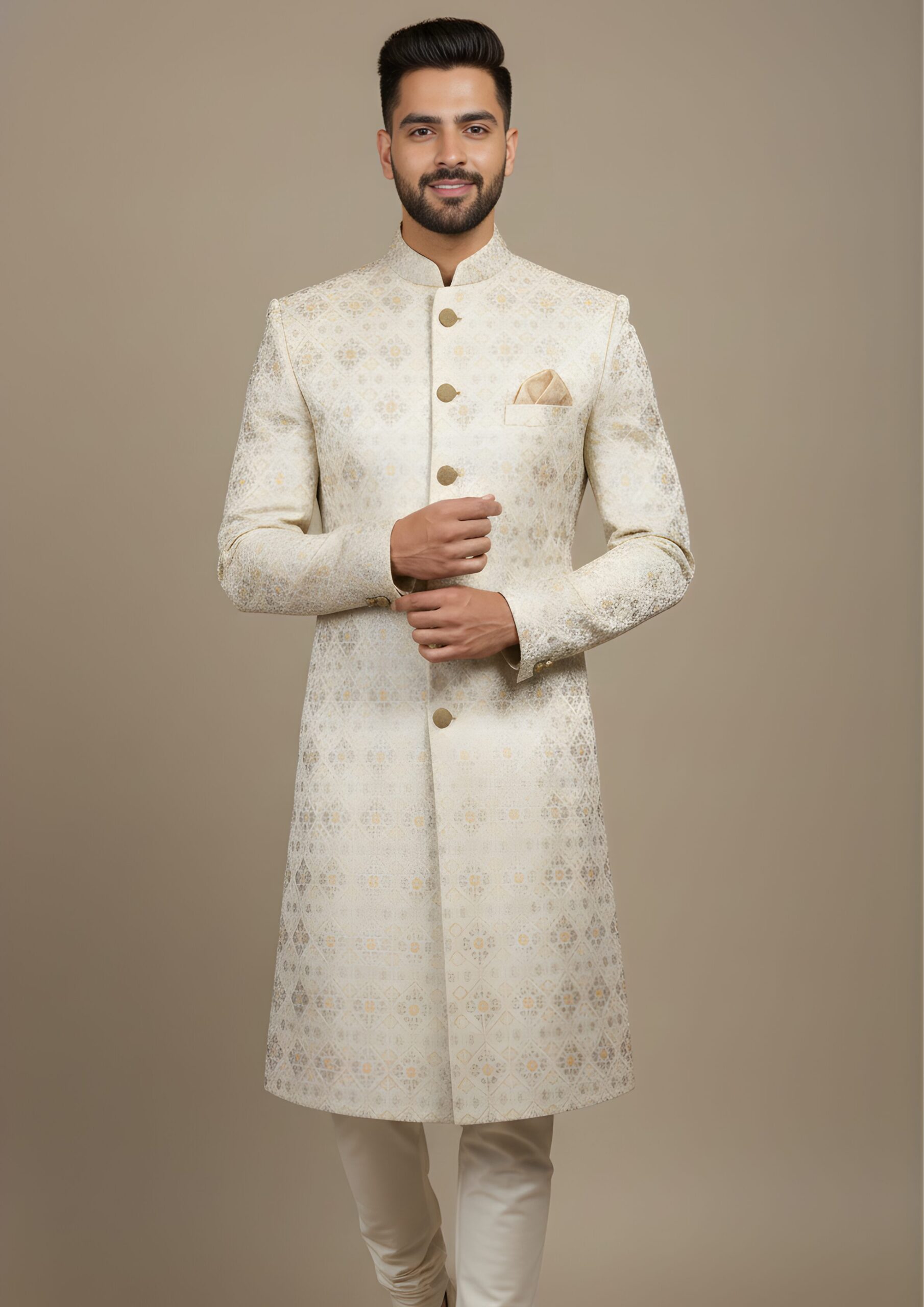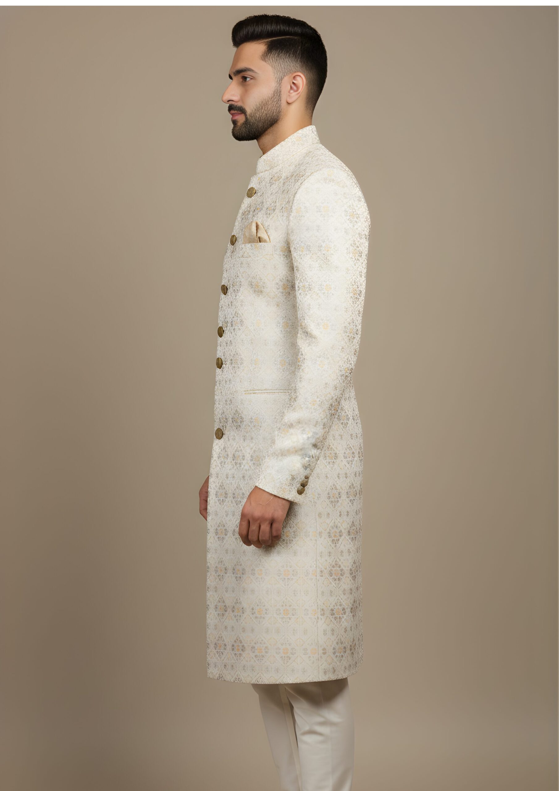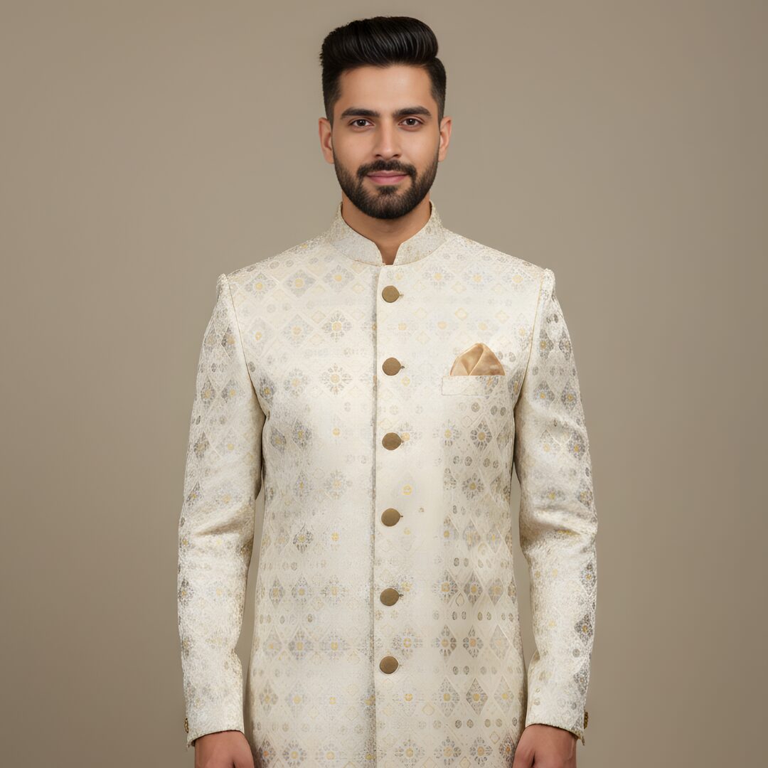 Step into the spotlight with a perfect blend of modern sophistication and timeless tradition. This Silver-Grey Jodhpuri-style Sherwani is meticulously crafted for the discerning man, offering a regal and commanding presence at weddings, grand receptions, or high-profile festive events.