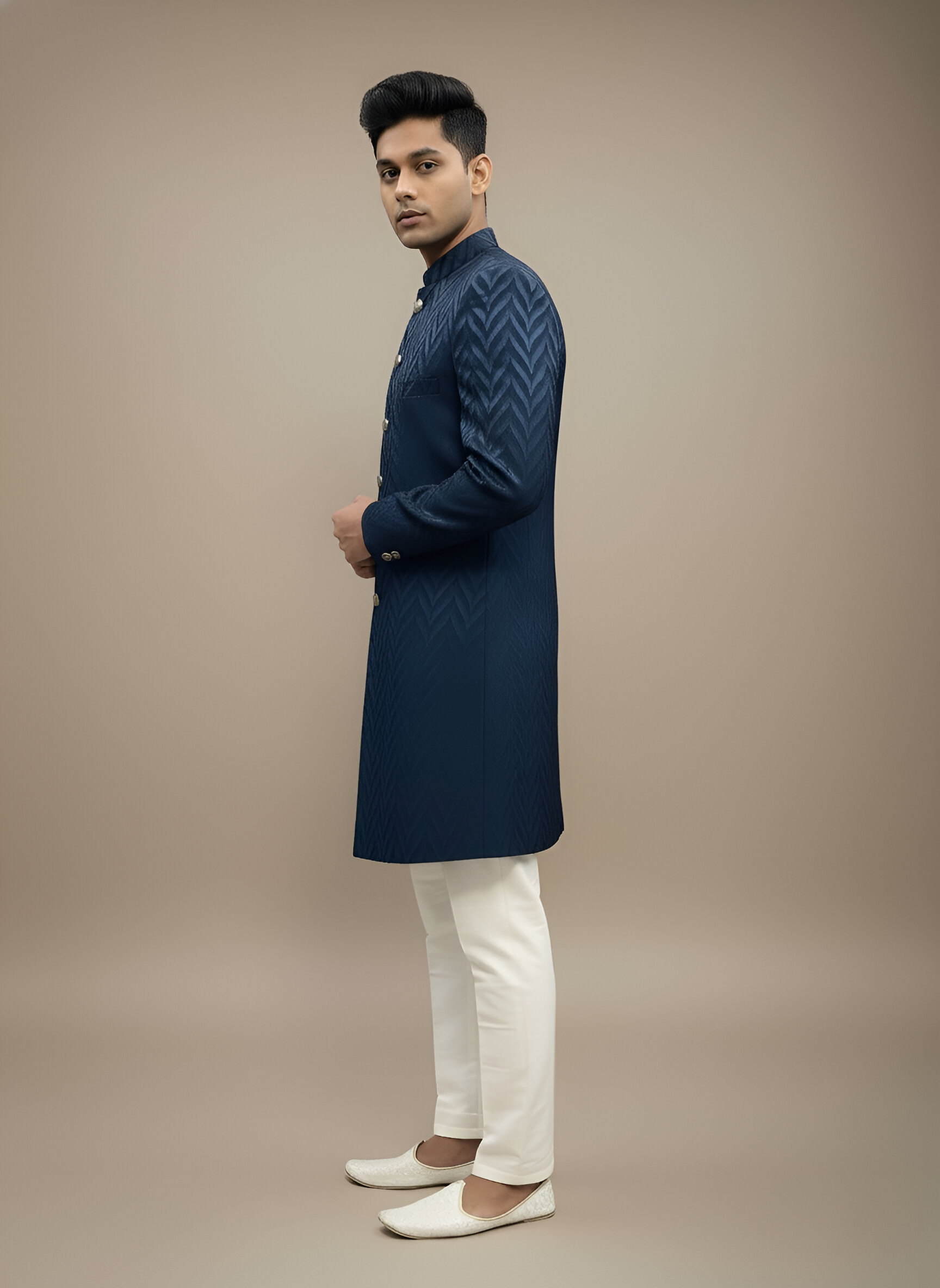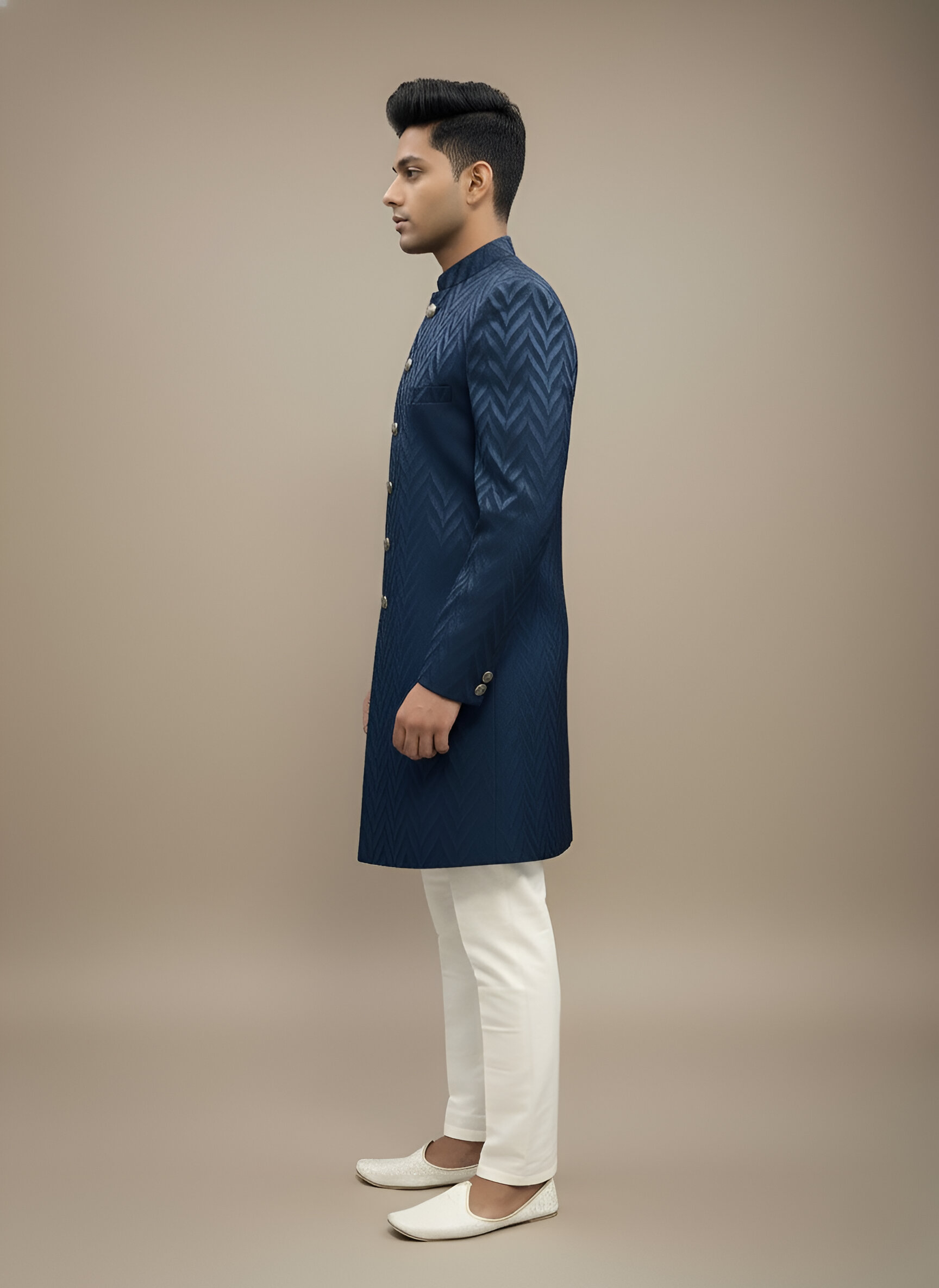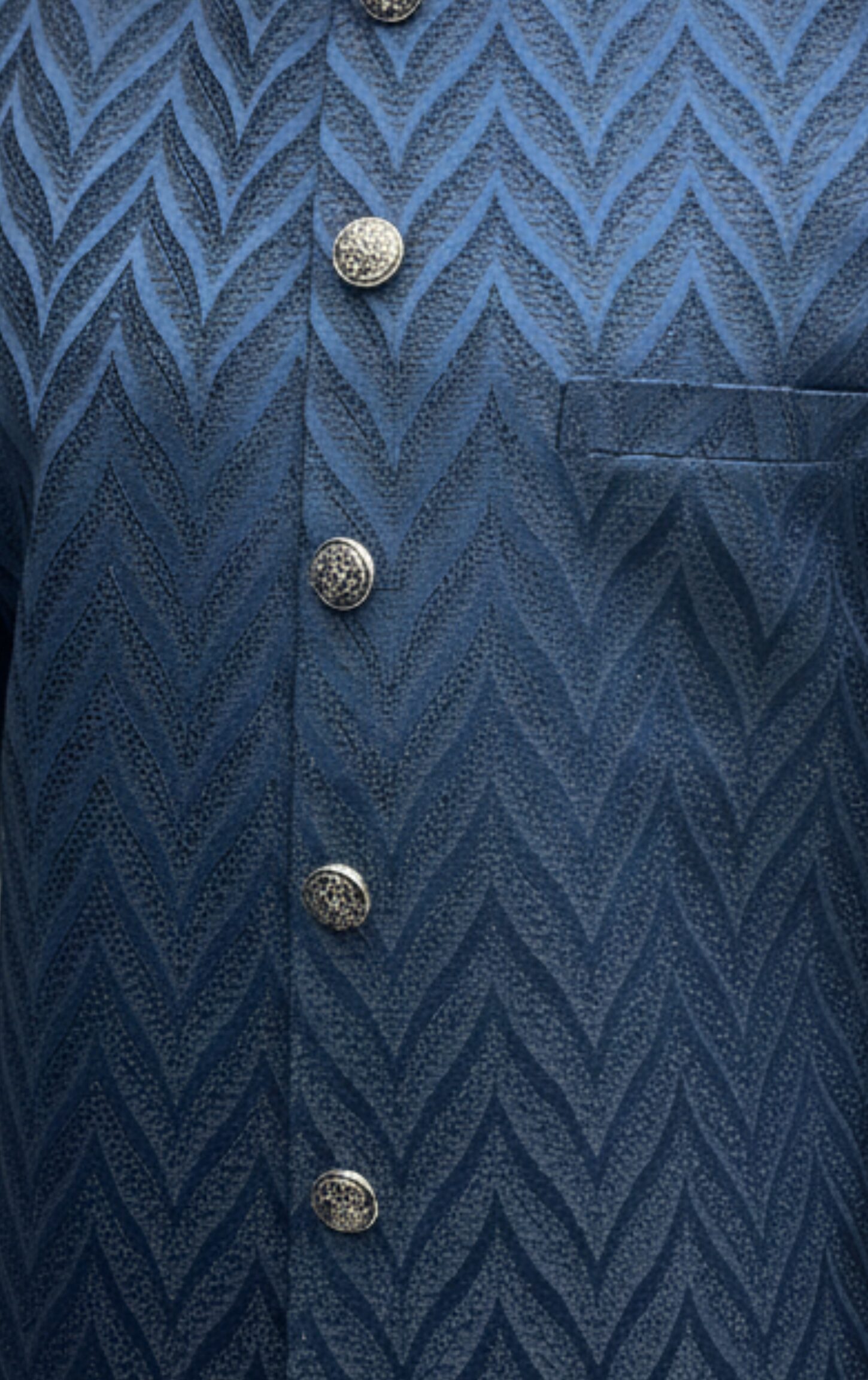 This magnificent Indo-Western Sherwani style outfit is an excellent example of a dynamic chevron pattern crafted on premium Brocade fabric. Its deep Navy Blue color and modern geometric design make it an impactful choice for formal and evening occasions.