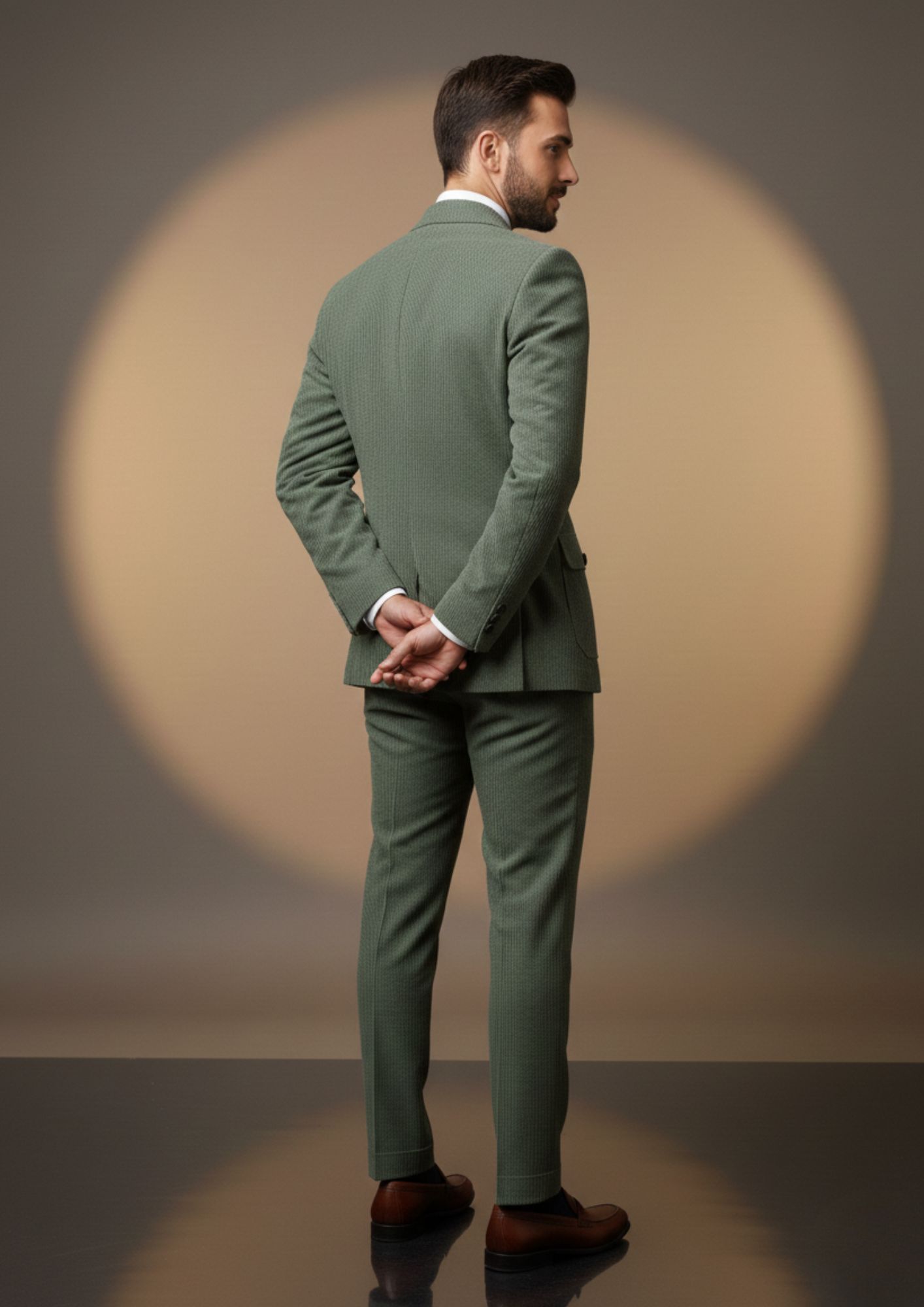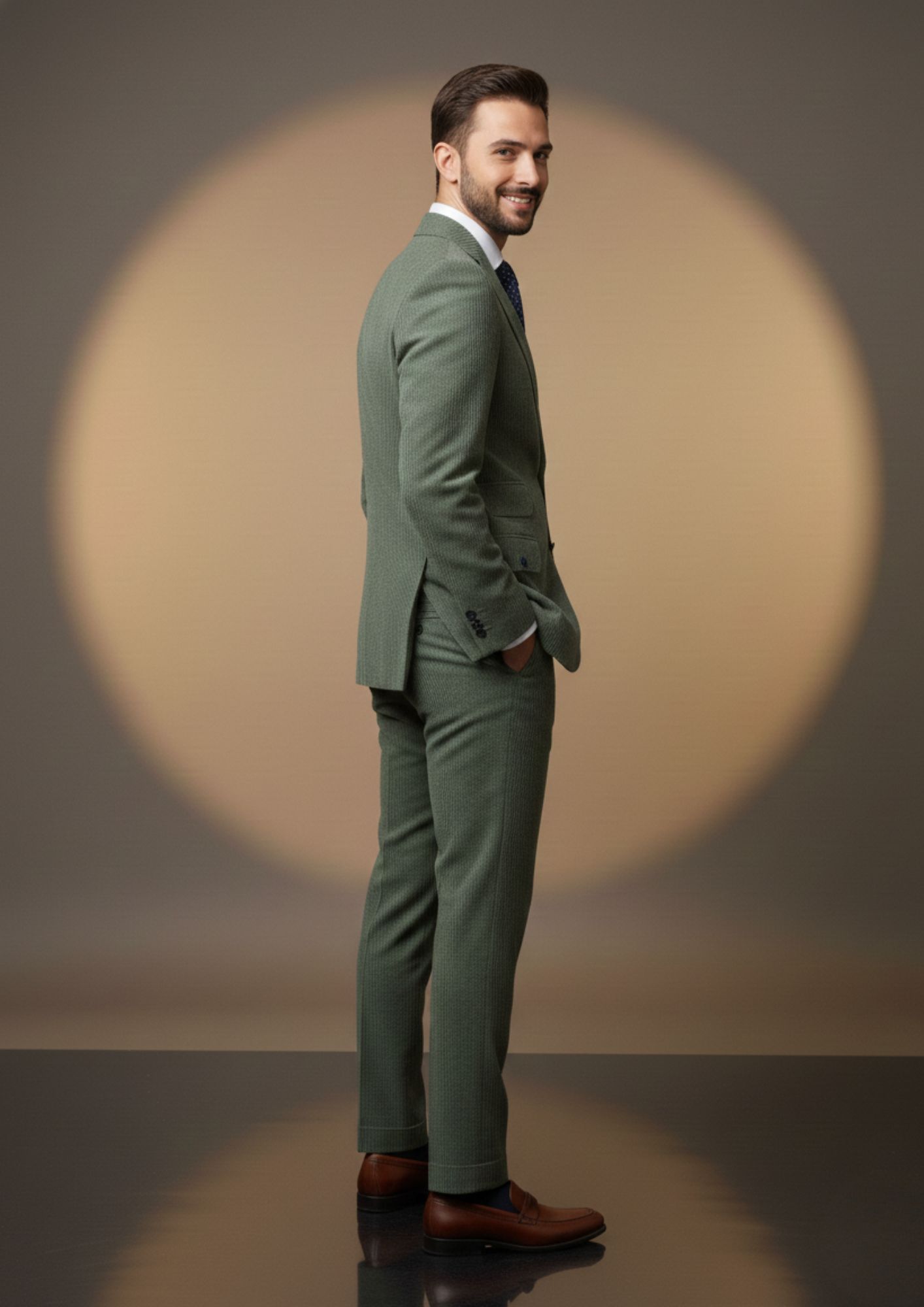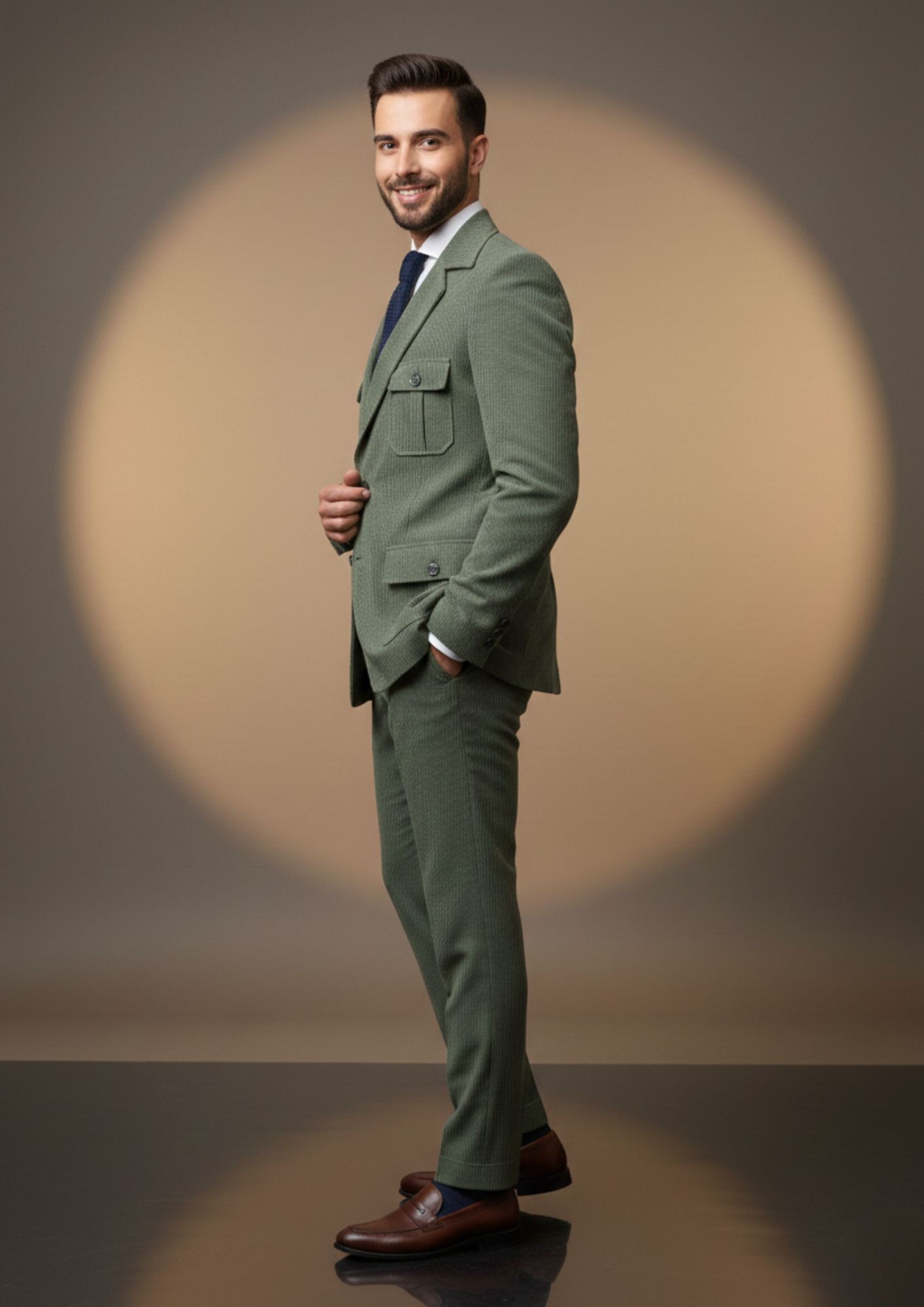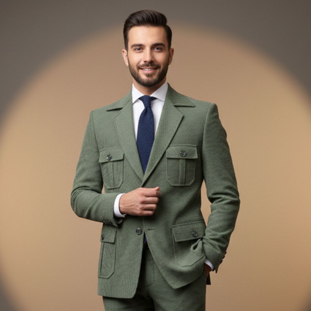 This distinctive light sage green suit is a perfect blend of contemporary style and utility. The unique safari-style jacket, featuring buttoned flap pockets, adds a fashionable edge to the soft, ribbed corduroy-like fabric, making it a standout choice for the modern man.