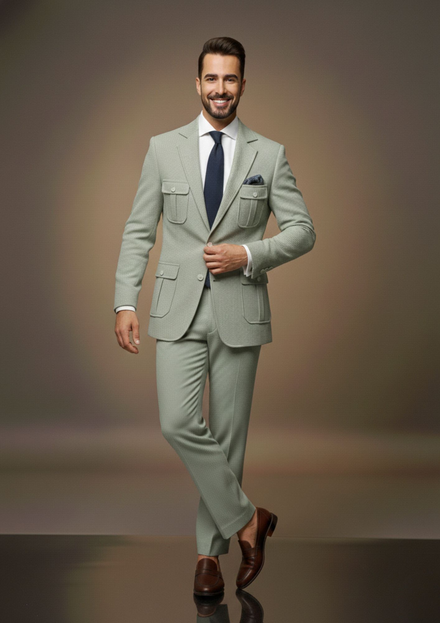 This distinctive light sage green suit is a perfect blend of contemporary style and utility. The unique safari-style jacket, featuring buttoned flap pockets, adds a fashionable edge to the soft, ribbed corduroy-like fabric, making it a standout choice for the modern man.