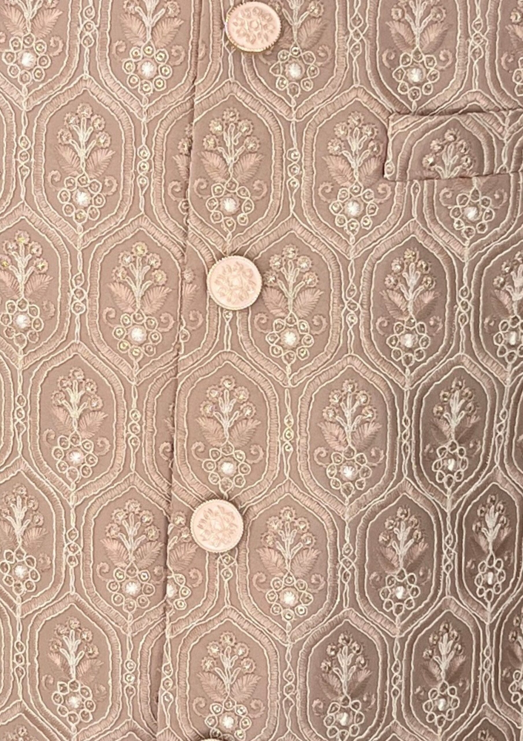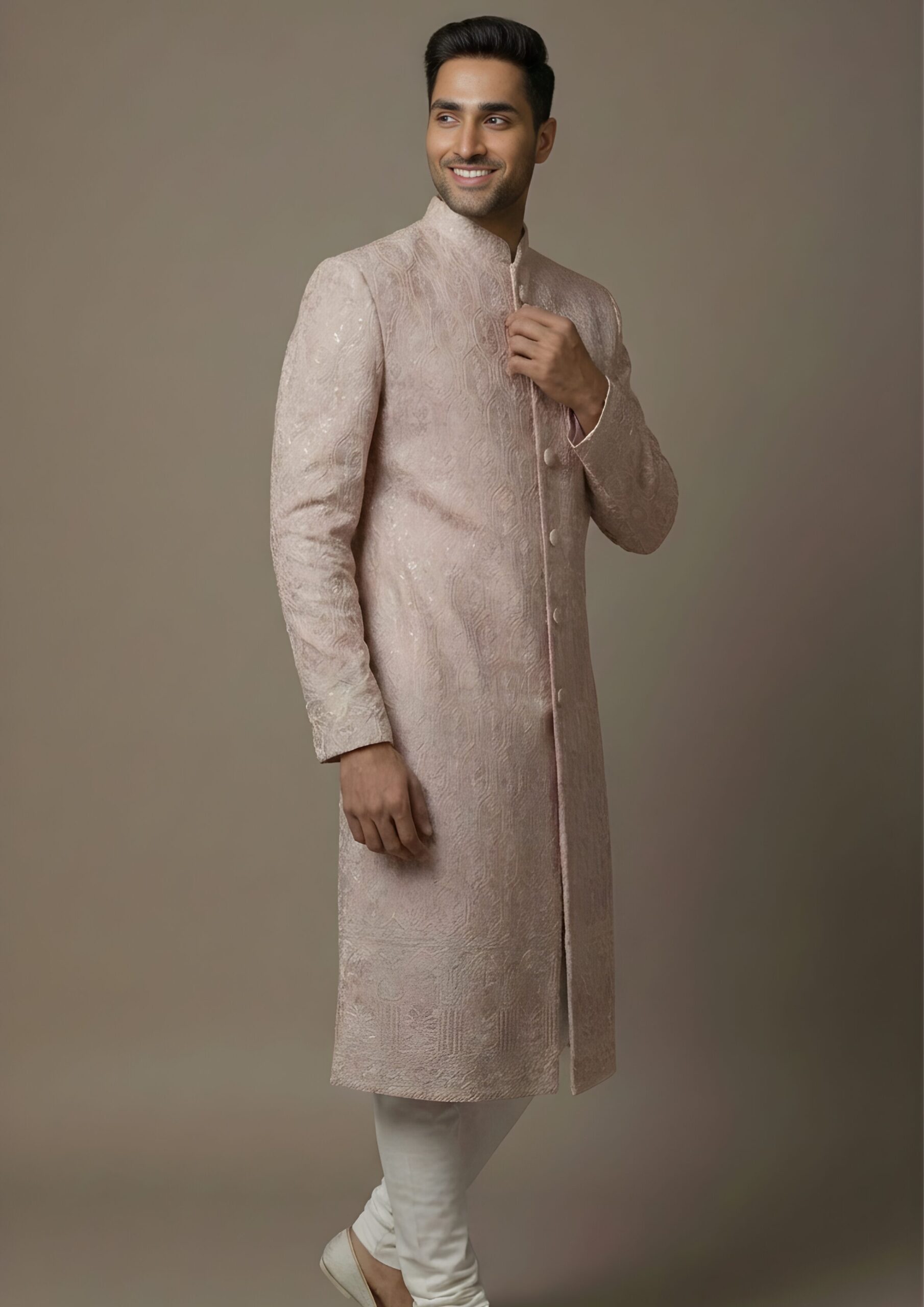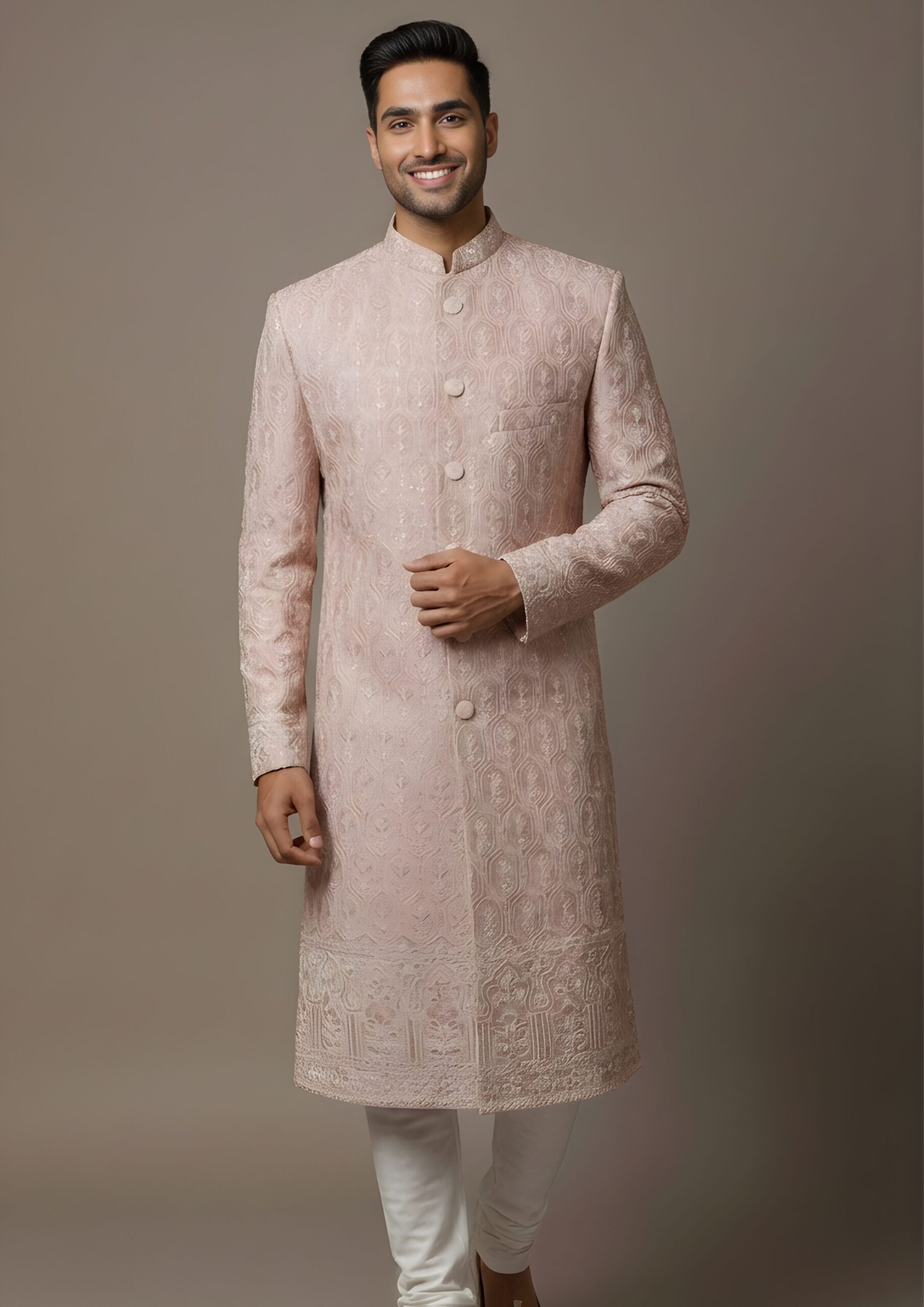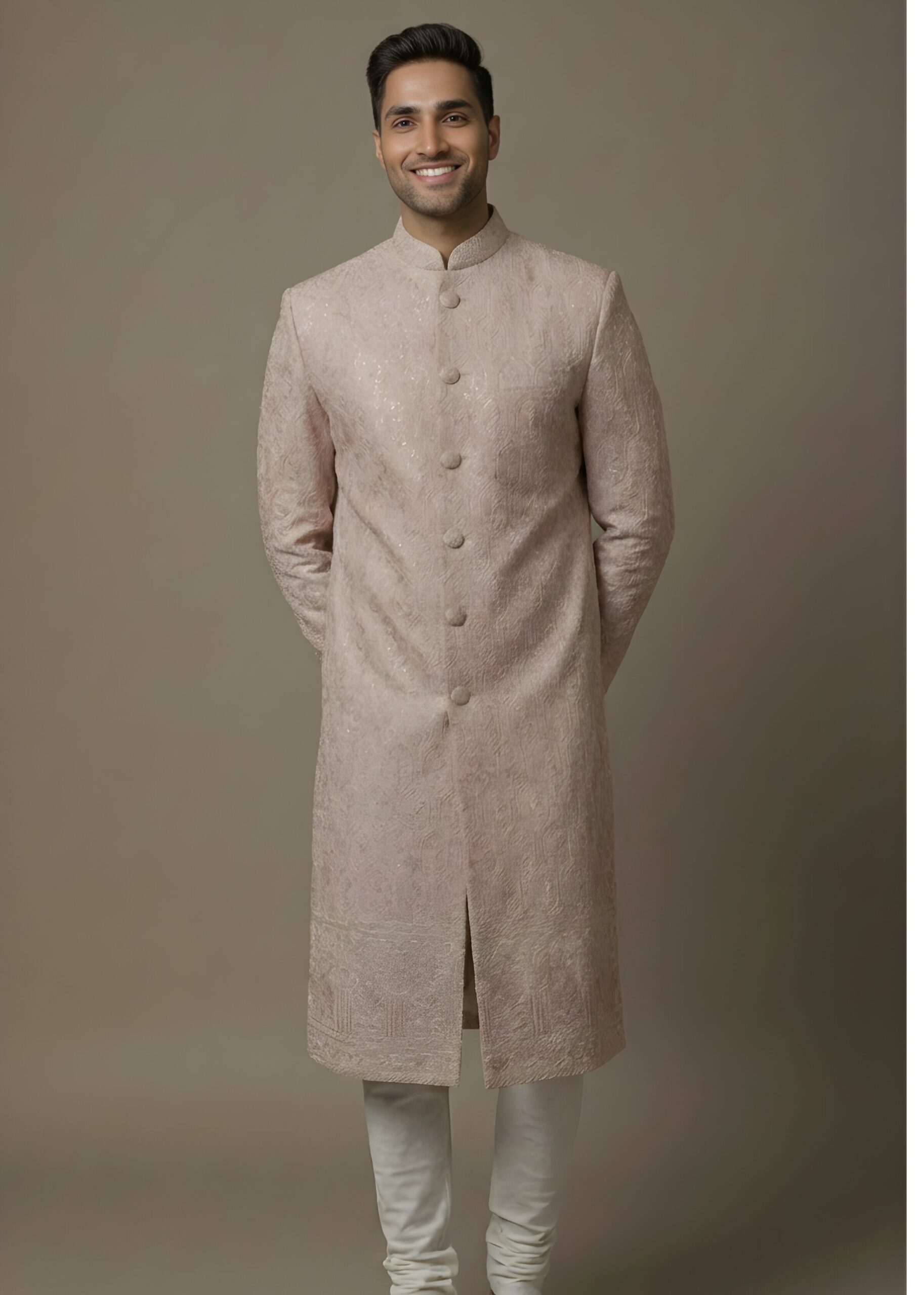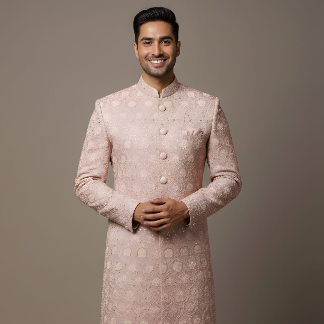Step into the spotlight with a garment that defines modern royalty and artistic excellence. This Champagne-Pink Indo-Western Sherwani is a masterpiece of ethnic craftsmanship, meticulously tailored for the man who seeks a sophisticated and regal presence at weddings, grand receptions, or elite festive gatherings.