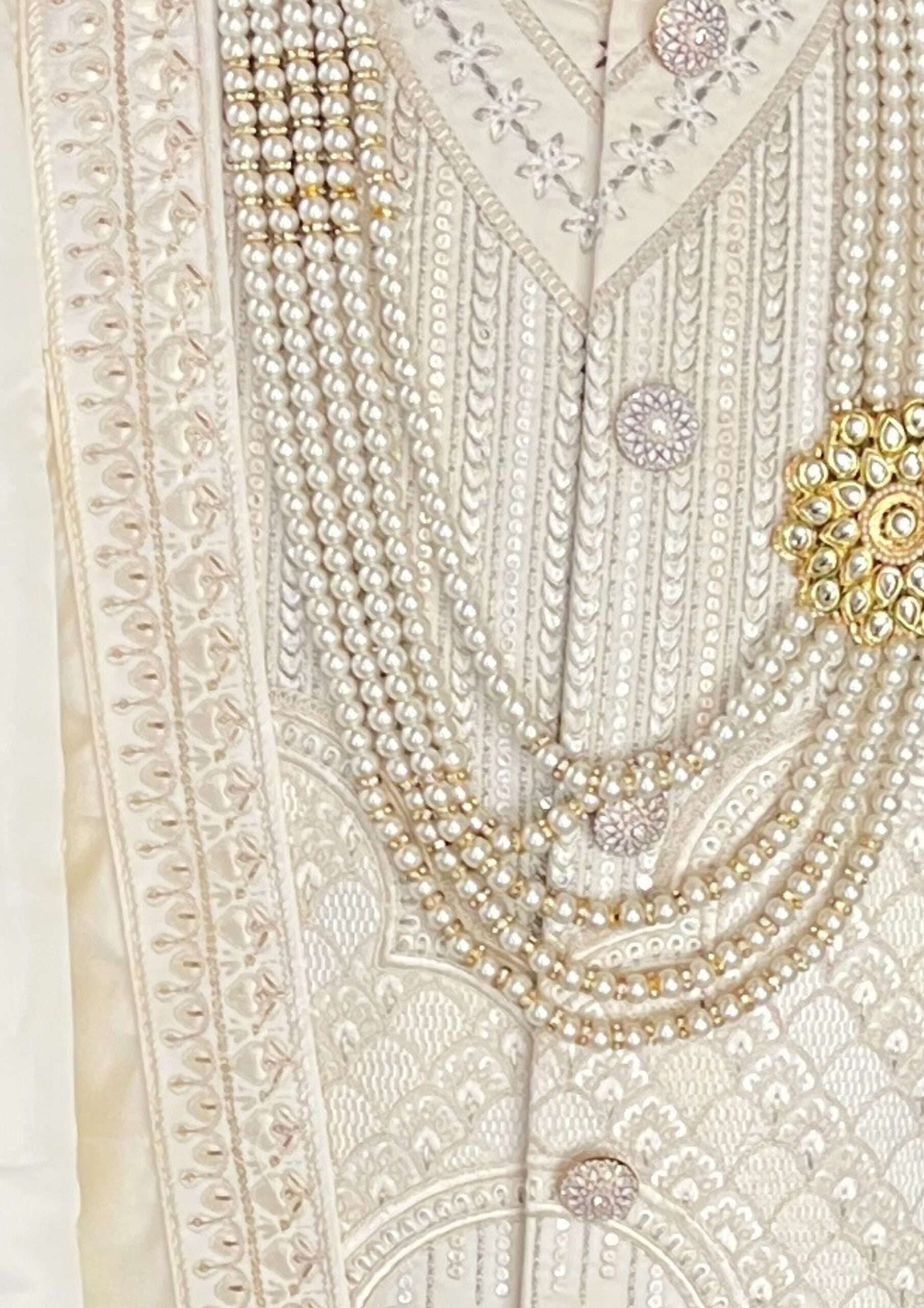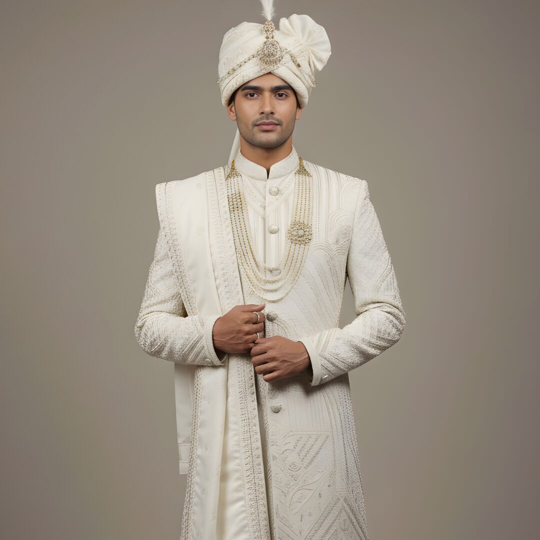 In the Box: 1 Sherwani Jacket, 1 Matching Turban, 1 Pearl Mala, aur 1 Embroidered Dupatta.