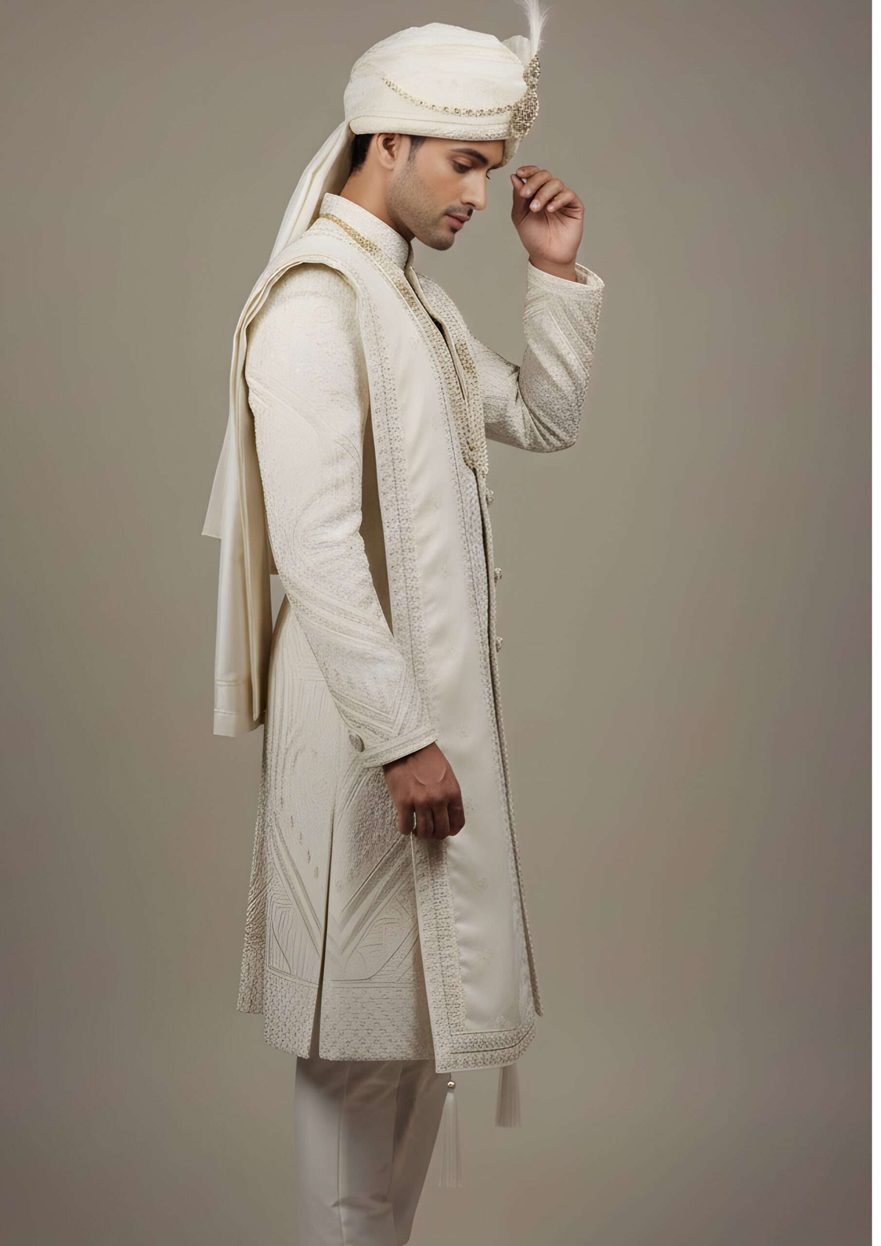 Heritage Elephant Motifs: Is sherwani ke niche ke panel (daman) par khubsoorat hathi (elephant) ke motifs bane hain, jo ancient Indian royalty aur shaan ka prateek hain.