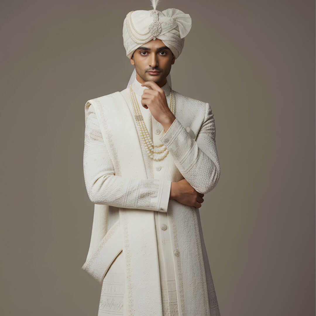 In the Box: 1 Sherwani Jacket, 1 Matching Turban, 1 Pearl Mala, aur 1 Embroidered Dupatta.
