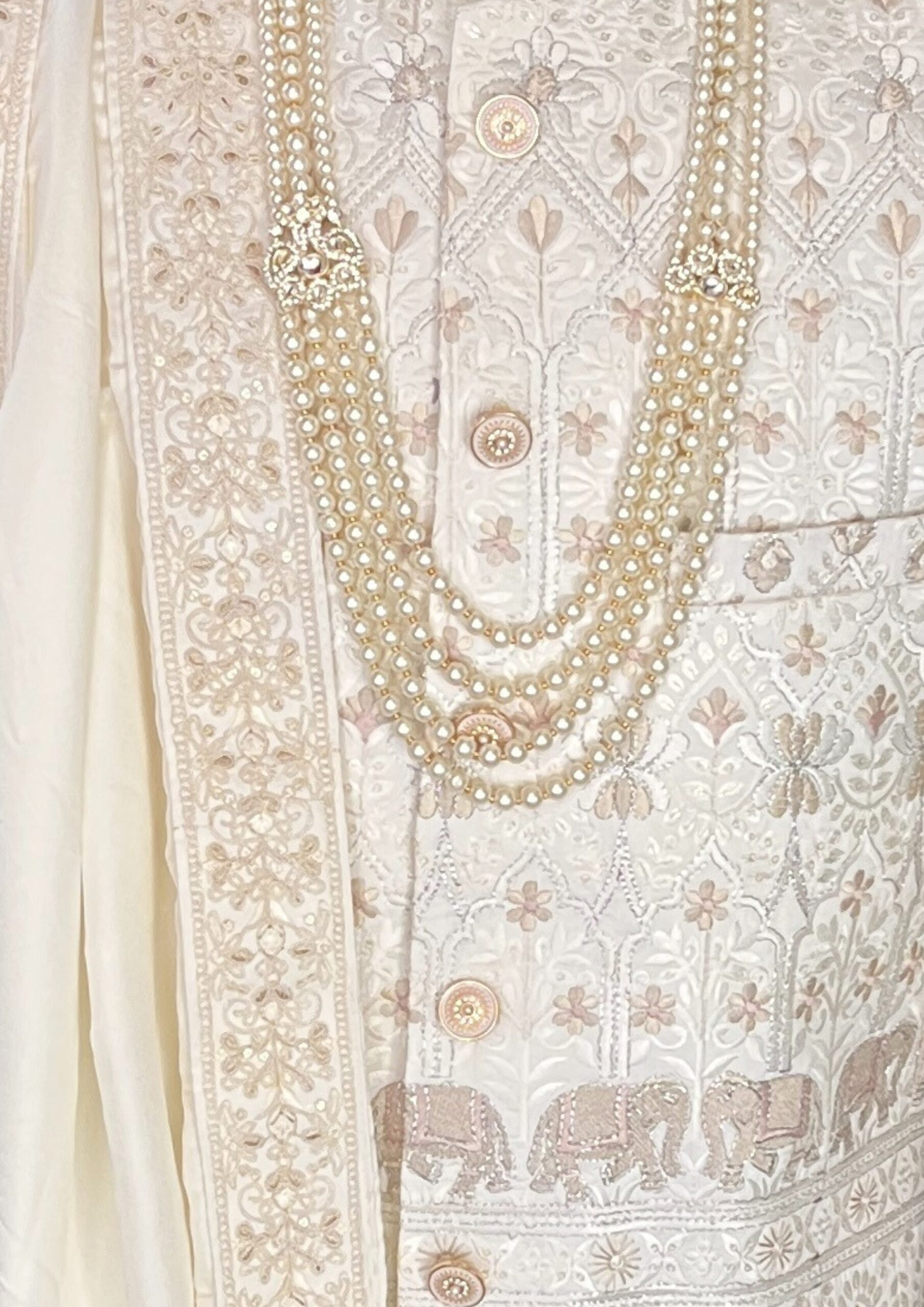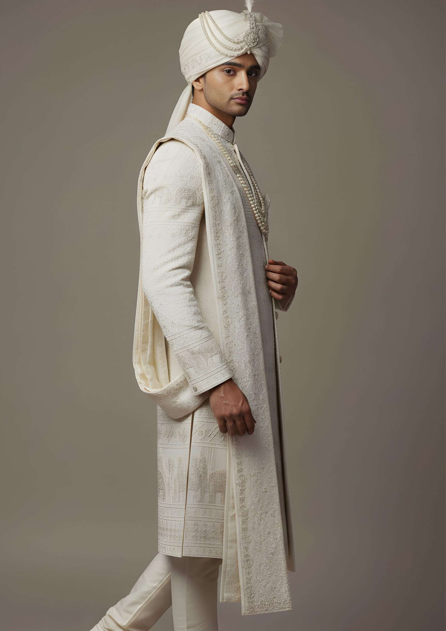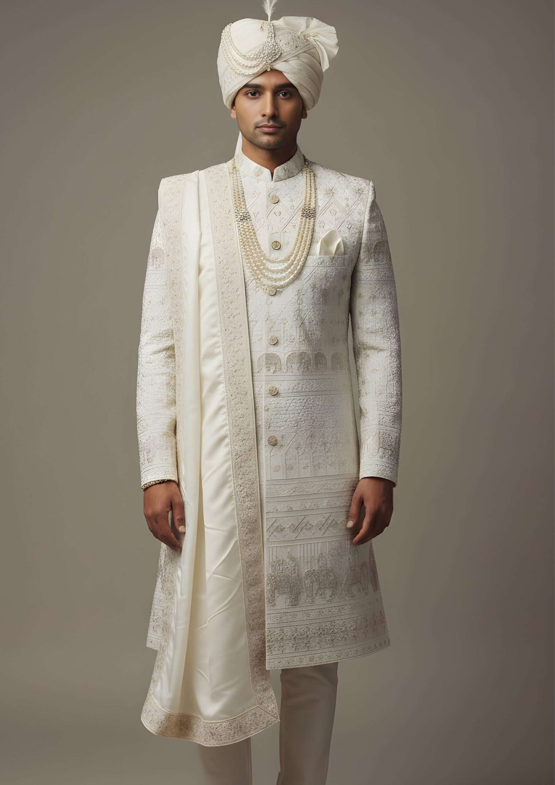 Heritage Elephant Motifs: Is sherwani ke lower panel par khubsoorat hathi (elephant) ke motifs bane hain, jo ancient Indian royalty ko darshate hain.