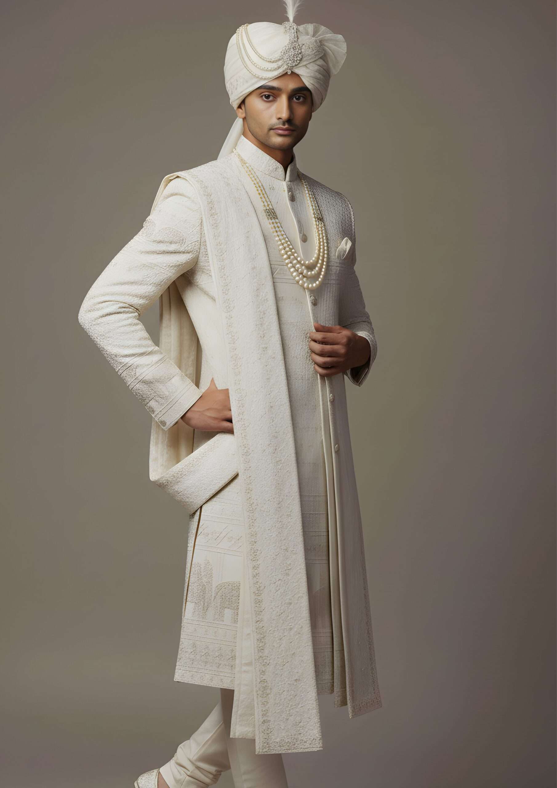 Designer Turban (Pagri): Matching ivory turban jis par elegant embroidery, pearl strings, ek shandaar silver-finish brooch aur safed feather (kalgi) laga hai.