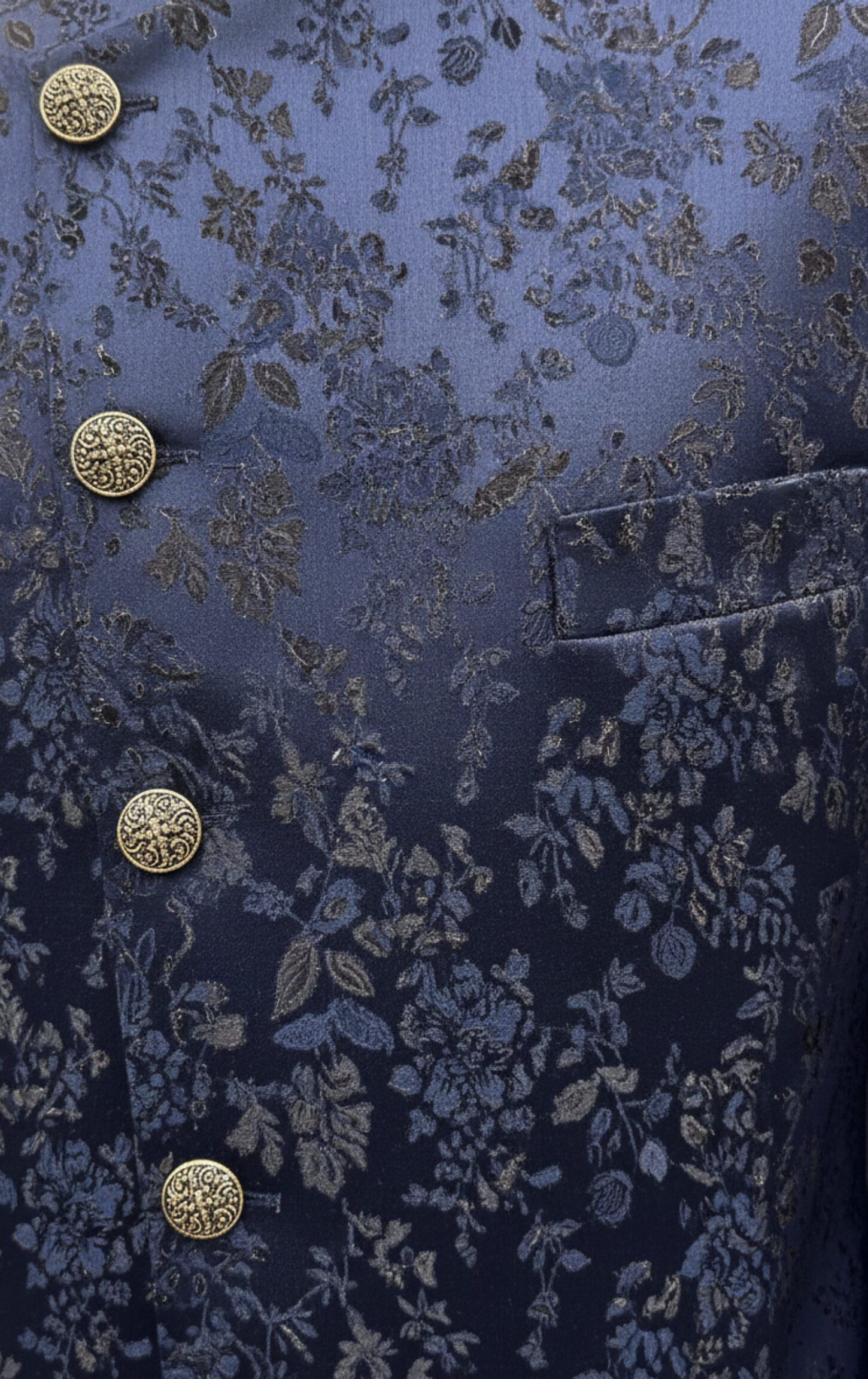 This modern Indo-Western Sherwani style outfit is an exquisite blend of premium Brocade fabric and a trendy asymmetrical hemline. Its deep Navy Blue color and sophisticated Jacquard print make it an impactful choice for grand evening functions.