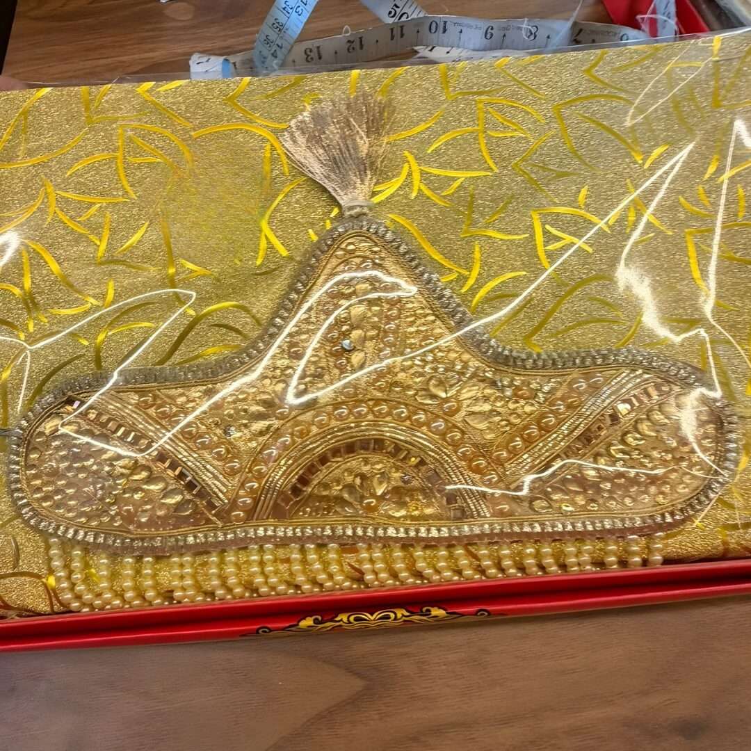 Intricate Artistry: Iske main crown par bariki se Golden Zardosi aur Gota-Patti ka kaam kiya gaya hai, jo isse ek rich aur antique texture deta hai.