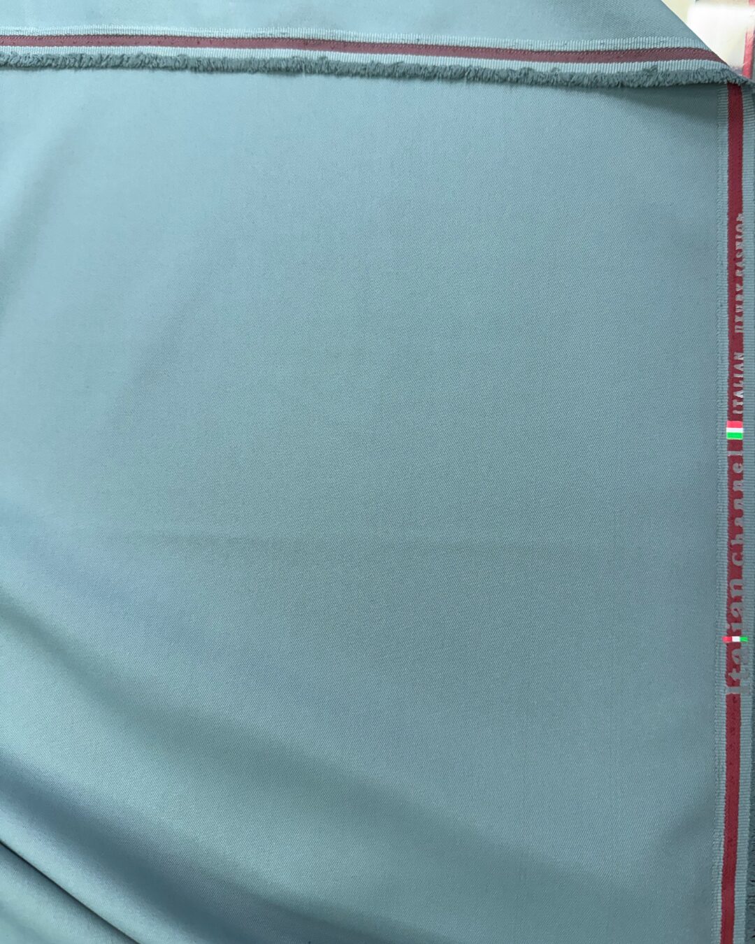 Distinctive Brand Identity: The fabric’s premium quality is verified by the signature “Italian Channel” branding woven along its selvage edge, accompanied by the Italian flag motif. This mark is a symbol of its luxurious pedigree.
