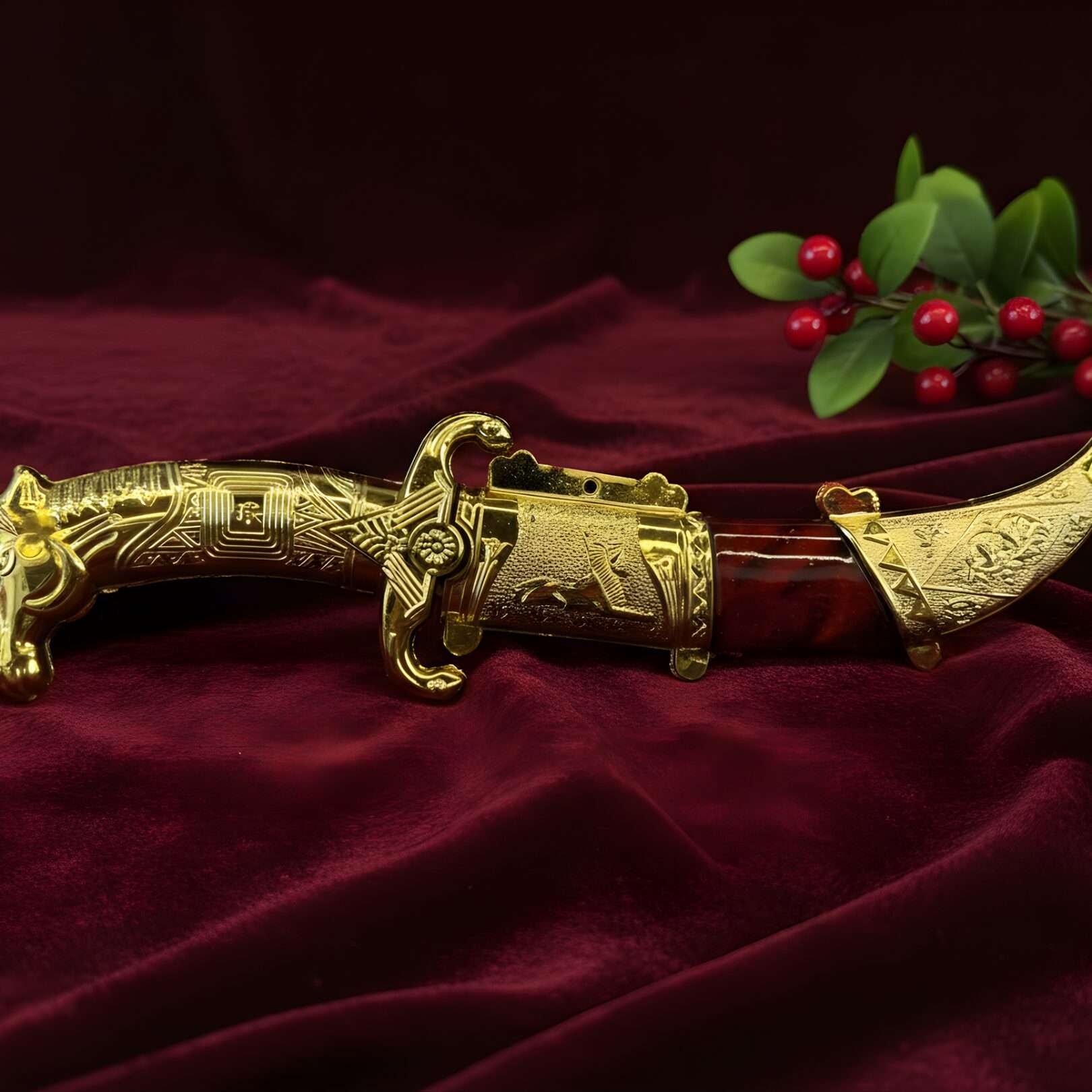 Gemstone & Engraving: * Ek khanjar par shandaar ruby-red square stones jade gaye hain aur uski myaan (scabbard) par barik floral pattern ka kaam hai.