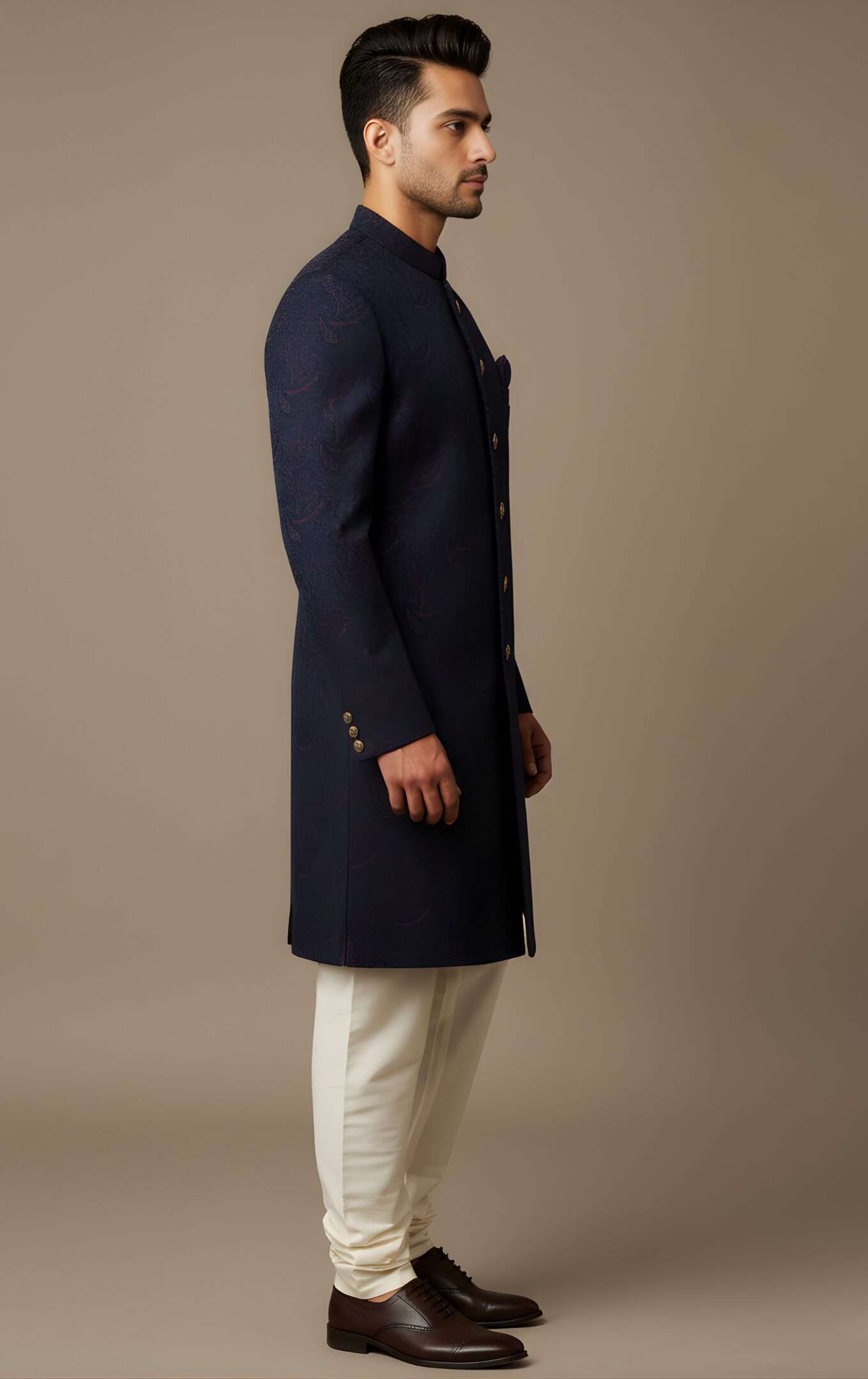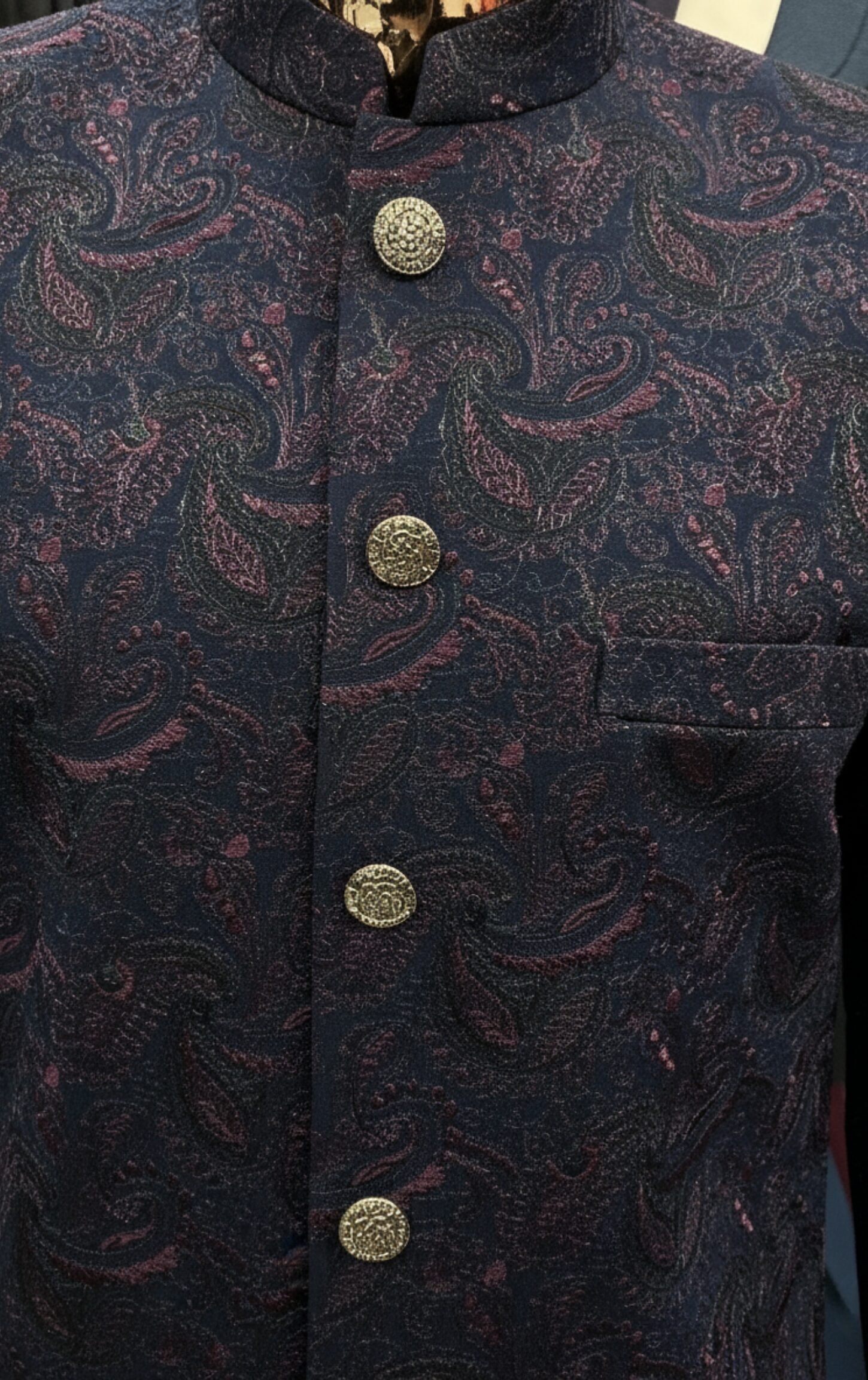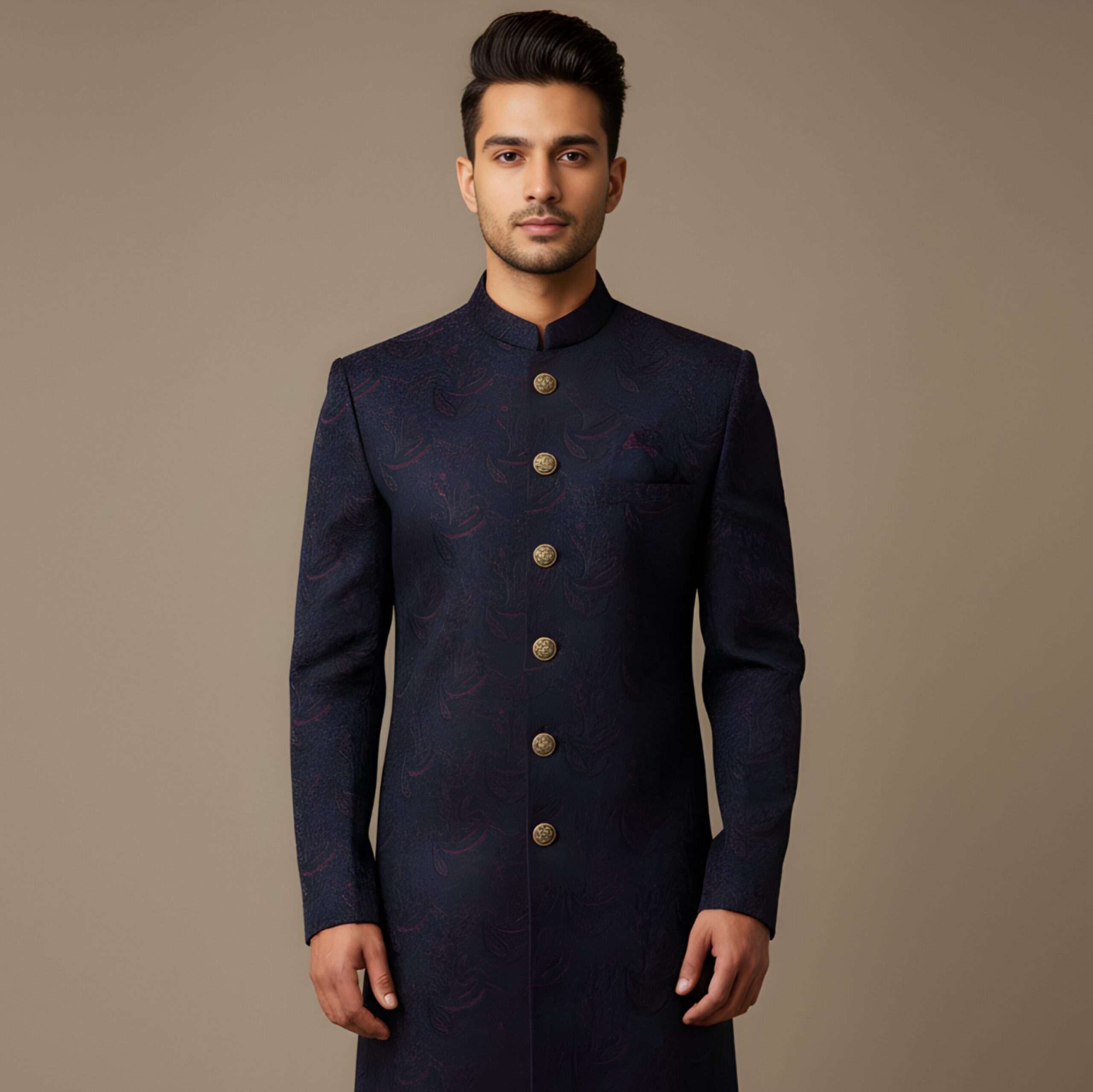 This magnificent Indo-Western Sherwani style outfit is an exquisite blend of premium Korean Fabric and fine thread work. Its deep Navy/Black color and subtle pattern make it an impactful and sophisticated choice for grand evening functions.