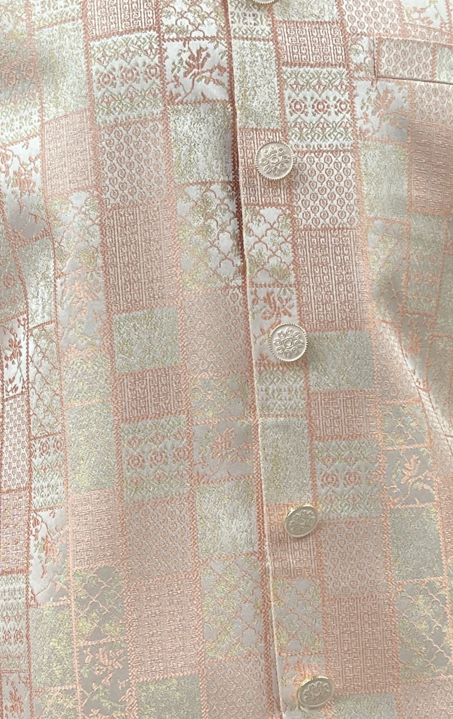 This trendy Indo-Western Sherwani style outfit is a unique blend of modern design and traditional Brocade craftsmanship. Its soft peach color and contemporary geometric pattern make it an excellent choice for daytime events and celebratory occasions.