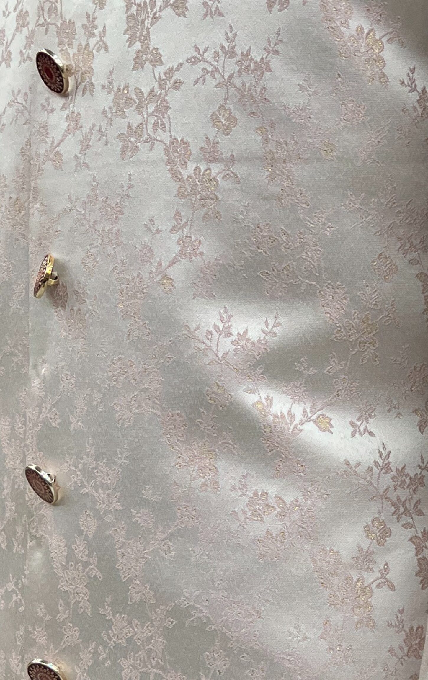 This elegant Indo-Western Sherwani style outfit is an exquisite example of a subtle, beautiful floral pattern crafted on premium Brocade fabric. Its classy off-white/cream hue makes it a magnificent choice for wedding days or any special occasion.