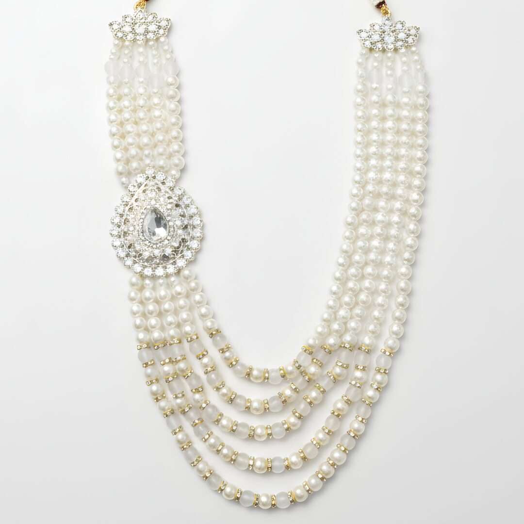 5-Layered Grandeur: Is mala mein motiyo ki cheh ghani ladiyan hain jo gale par ek bhara-pura look deti hain.