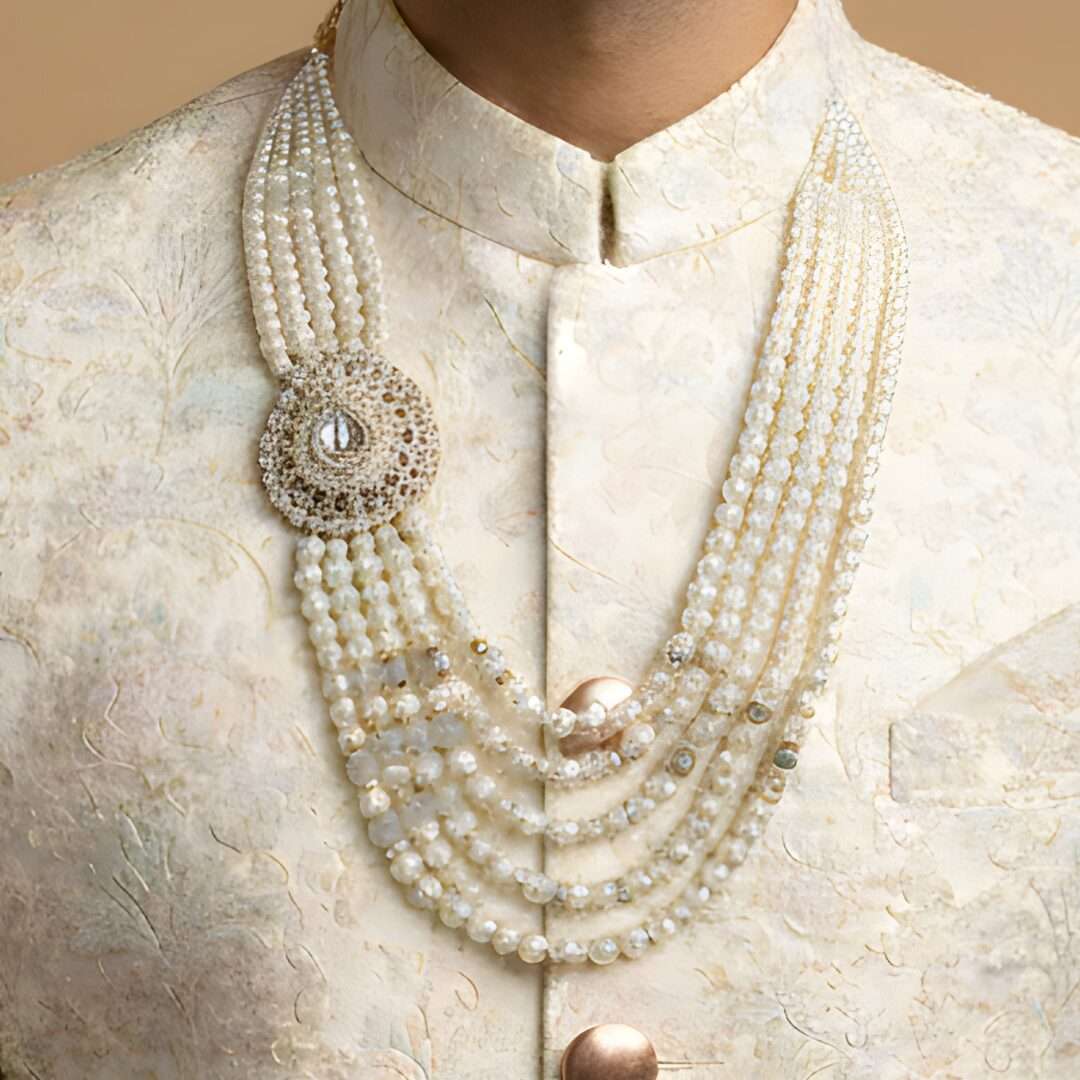 The Royal Groom: Yeh mala Dulhe (Groom) ki Sherwani ke liye ek behtareen choice hai. Ise aap White, Cream, ya Navy Blue rang ke outfits ke saath pehen kar ek shandaar look paa sakte hain.